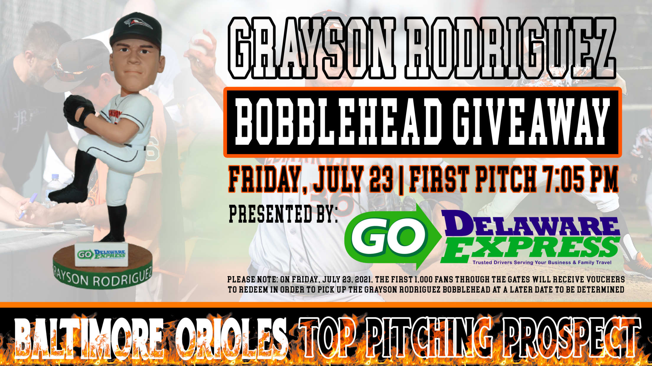 Please note: All fans who want to receive a Grayson Rodriguez Bobblehead must have a voucher that will be handed out to the first 1,000 fans through the gates on Friday, July 23 to be redeemed at a later date to be determined.