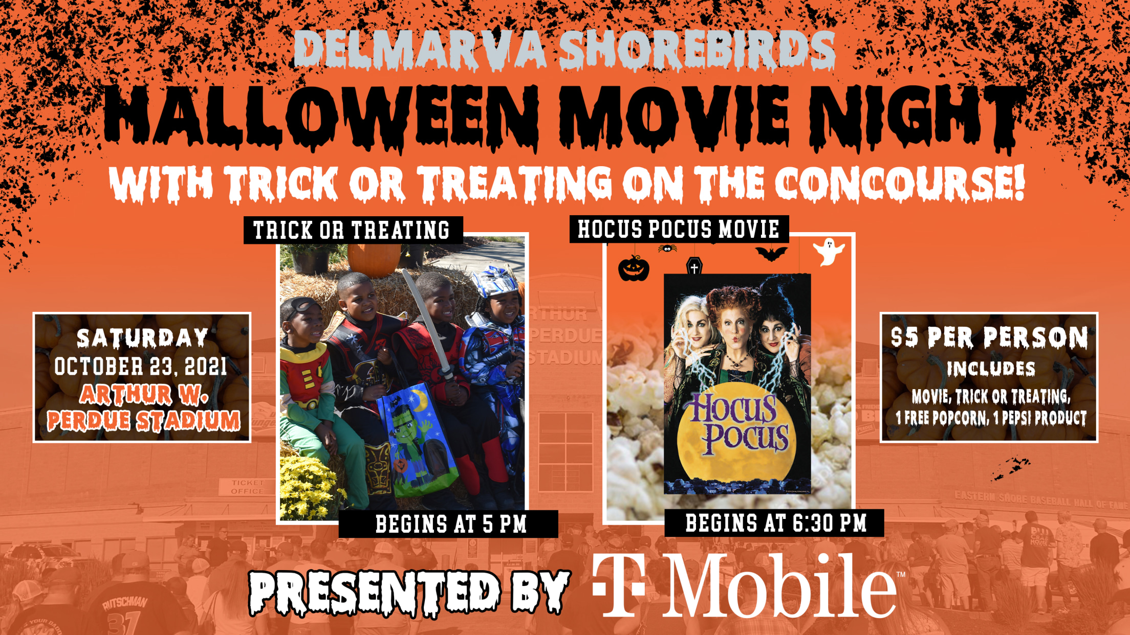 On Saturday, October 23, the Delmarva Shorebirds will be hosting a special Halloween Movie Night featuring the film Hocus Pocus along with Trick or Treating prior to the film at Arthur W. Perdue Stadium presented by T-Mobile. Gates will open for Trick or Treating at 5 PM on the second