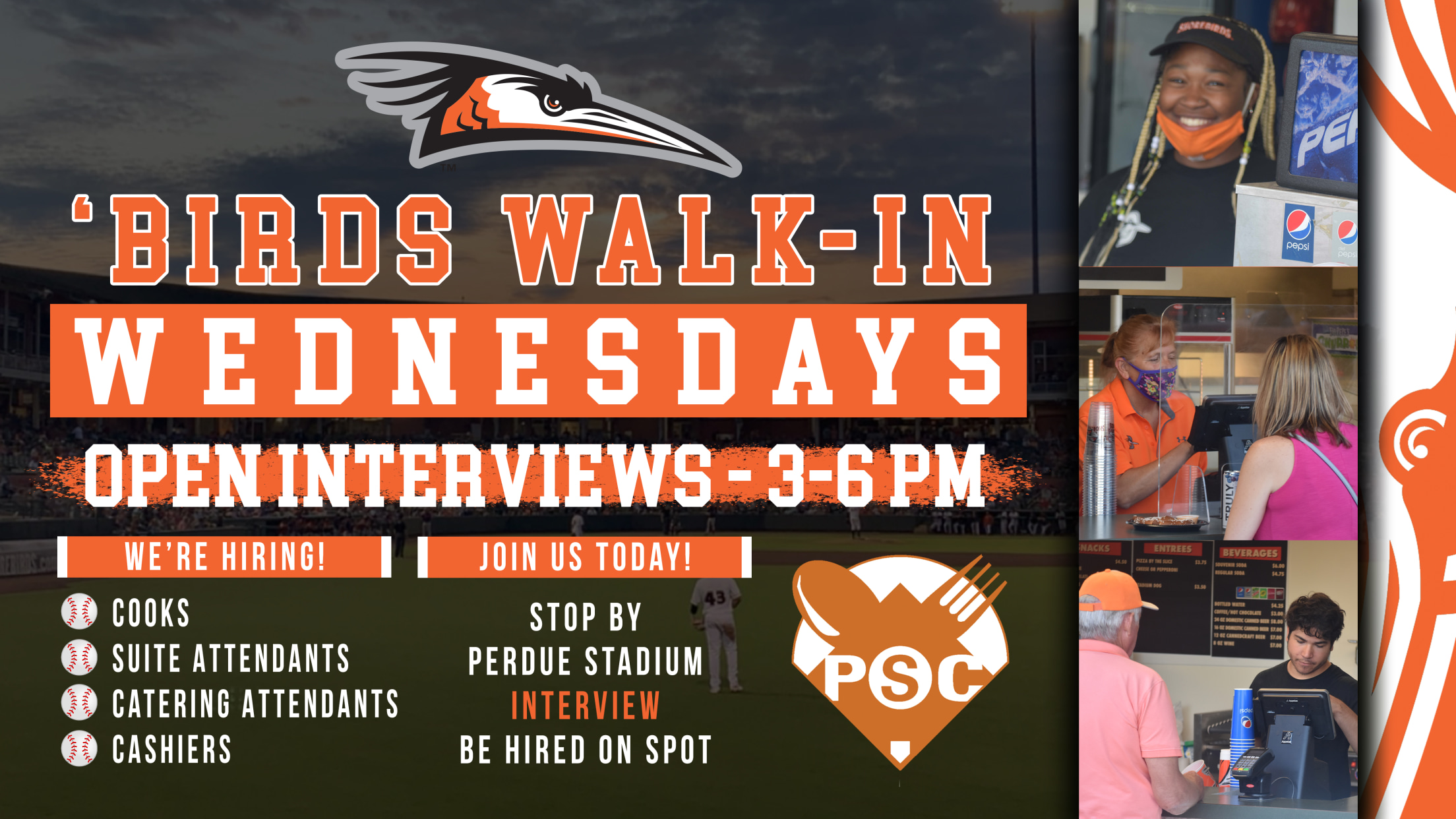 Salisbury, MD -- The Delmarva Shorebirds and Professional Sports Catering will be hosting Walk-In Wednesdays with open interviews starting March 2 from 3-6 PM to fill various gameday roles. Professional Sports Catering is looking to fill the positions of cooks, suite attendants, catering attendants, and cashiers for the 2022 Shorebirds