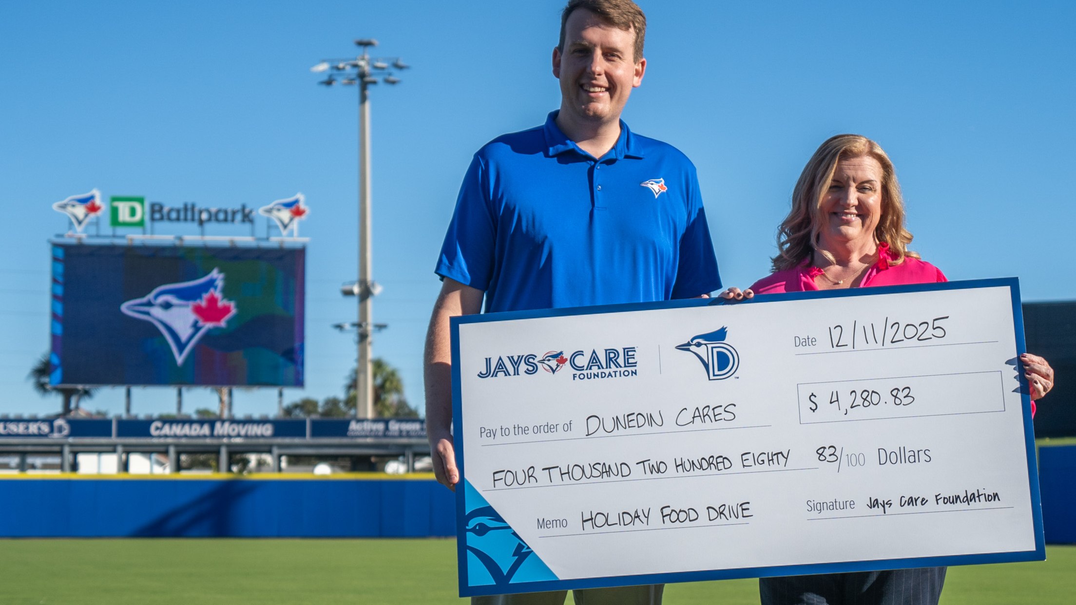 DUNEDIN, FL – The Toronto Blue Jays and Jays Care Foundation are proud to announce the donation of proceeds from a Spring Training 50/50 raffle to three local beneficiaries. A total of $12,842.50 will be evenly divided among Greater Dunedin Little League, Dunedin Cares Food Pantry, and BayCare’s St. Joseph’s