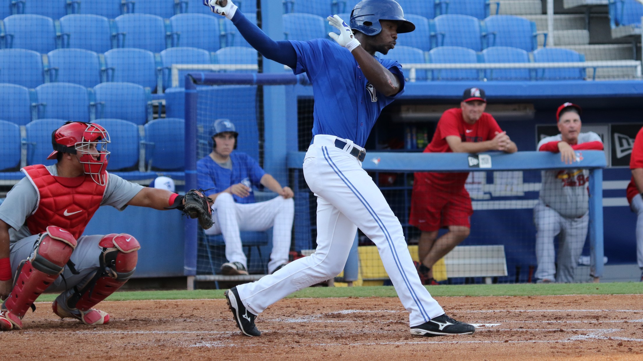 Following an eighth inning fielding error, Blue Jays left fielder D.J. Davis wasted little time redeeming himself in Dunedin's thrilling 3-2 extra innings win over the Palm Beach Cardinals on Wednesday night at Florida Auto Exchange Stadium. In the tenth inning, Davis proved his dropped fly ball in the eighth