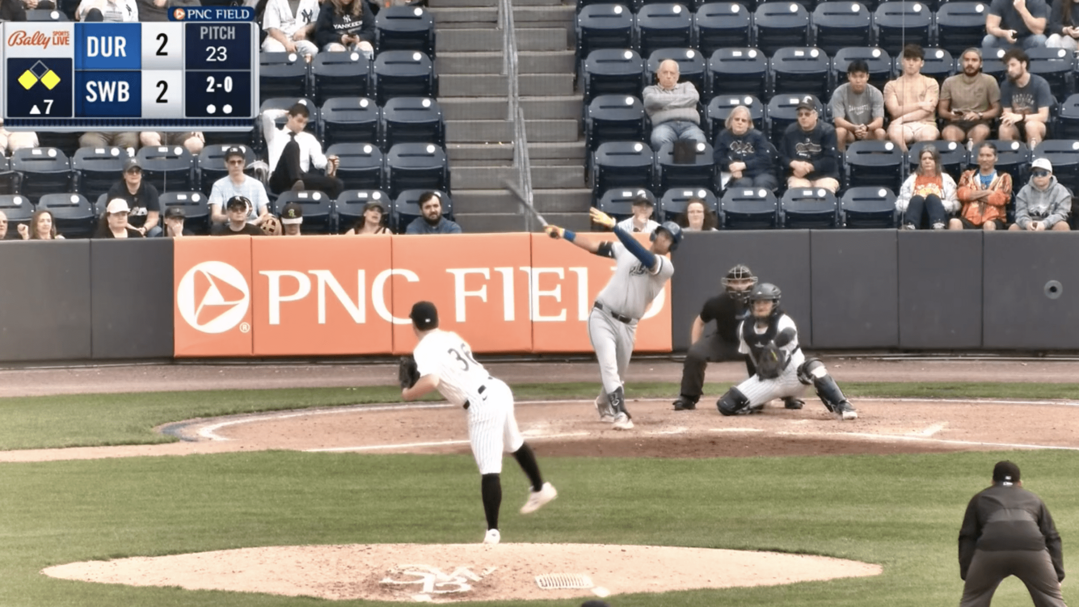 FOR IMMEDIATE RELEASE April 10, 2026 Email: [email protected] Moosic, PA --- The Durham Bulls erupted for eight runs in the top of the seventh to win the opener of Friday's doubleheader over Scranton/Wilkes-Barre 10-2 at PNC Field. The second game was postponed due to rain. With the game tied 2-2,