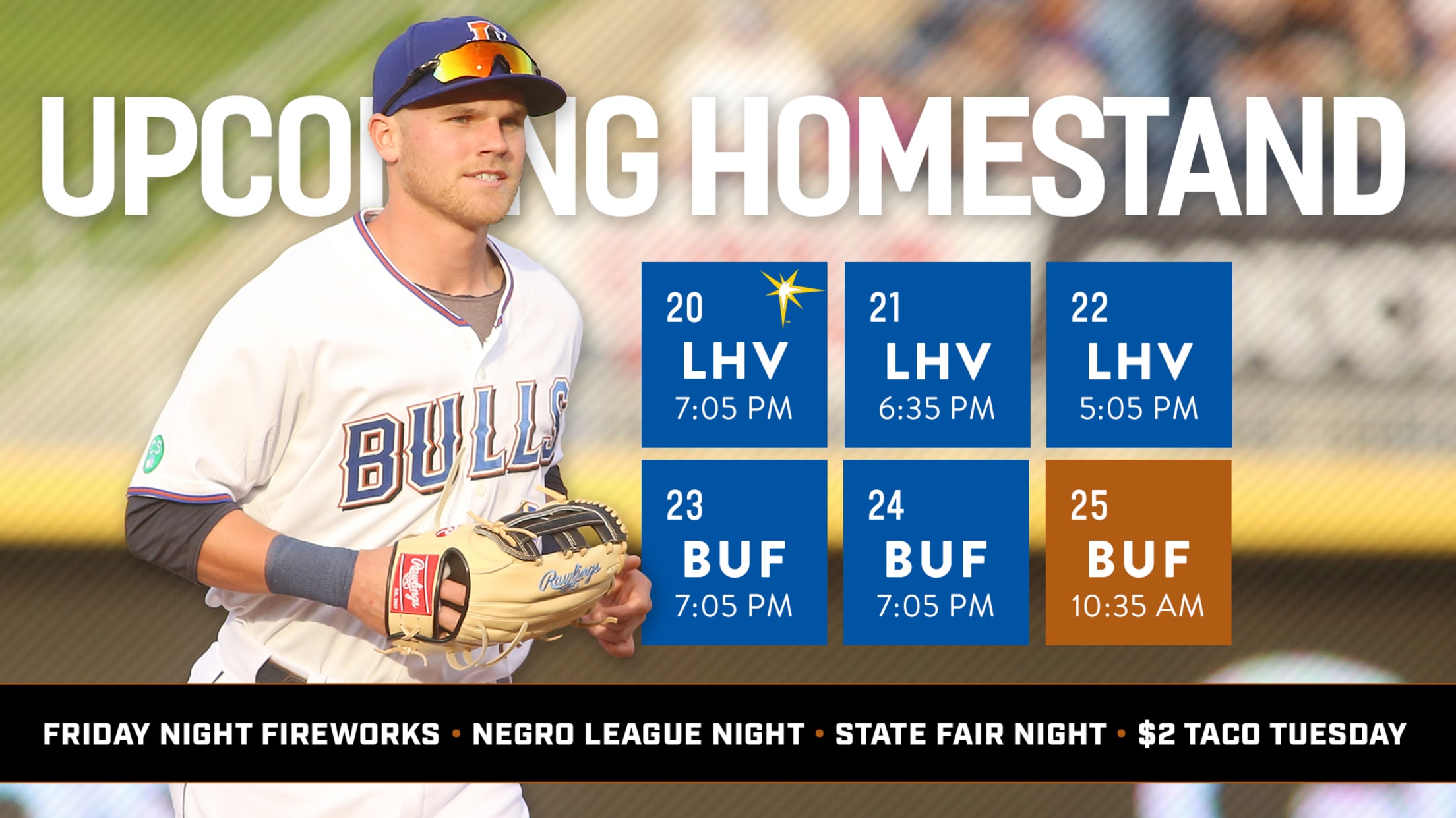 The Durham Bulls open a six-game homestand against the Lehigh Valley IronPigs and Buffalo Bisons on Friday, April 20 at Durham Bulls Athletic Park. The team's inaugural State Fair Night, Food Truck Friday and $2 Taco Tuesday highlight the promotional schedule.The homestand begins with the first of three games against