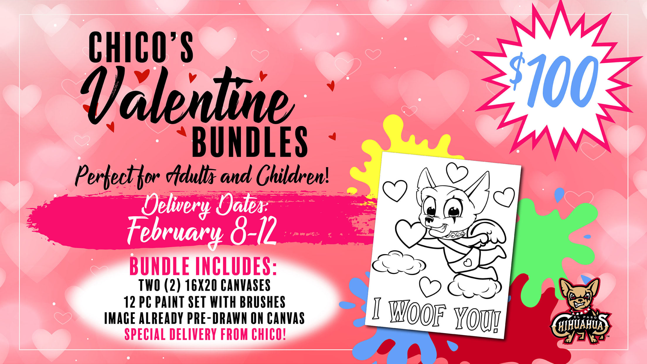 Chico’s Valentine’s Day Bundle includes two pre-sketched 16x20 canvases, two sets of paint brushes, a paint set, and two easels, all hand delivered by Chico himself.