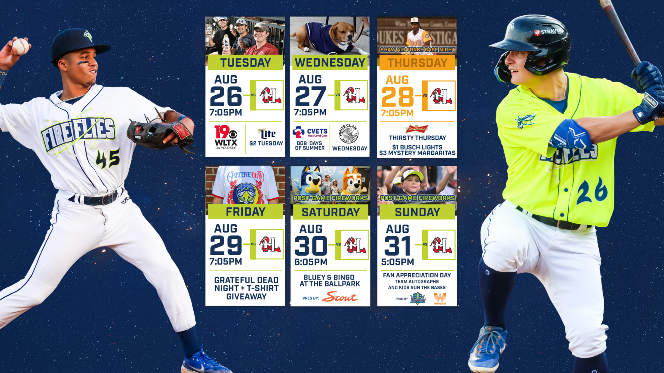 COLUMBIA, S.C. — The Fireflies have one home series remaining prior to the playoffs and the team is pulling out all the stops for family fun at the ballpark! The week is loaded with promotions including our annual Pack the Park for Charity game, Grateful Dead Night with a t-shirt giveaway and Bluey Night! Don’t miss out on your last chance to catch the Fireflies before the playoffs begin in September.