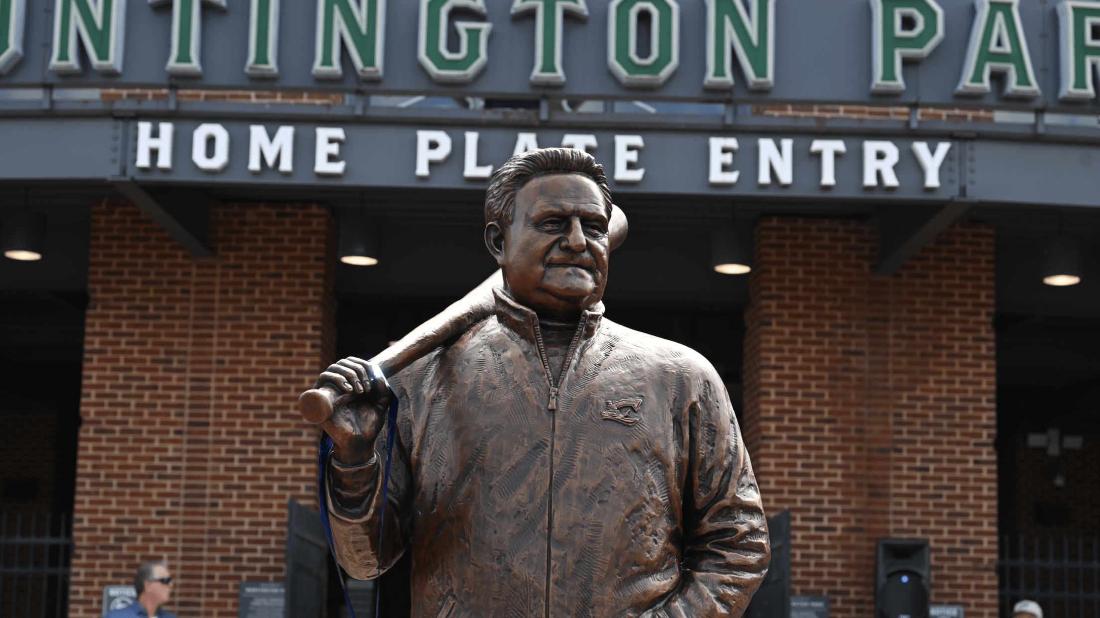 The statue of Ken Schnacke is unveiled on March 29 at Huntington Park. (Jay Gehres)