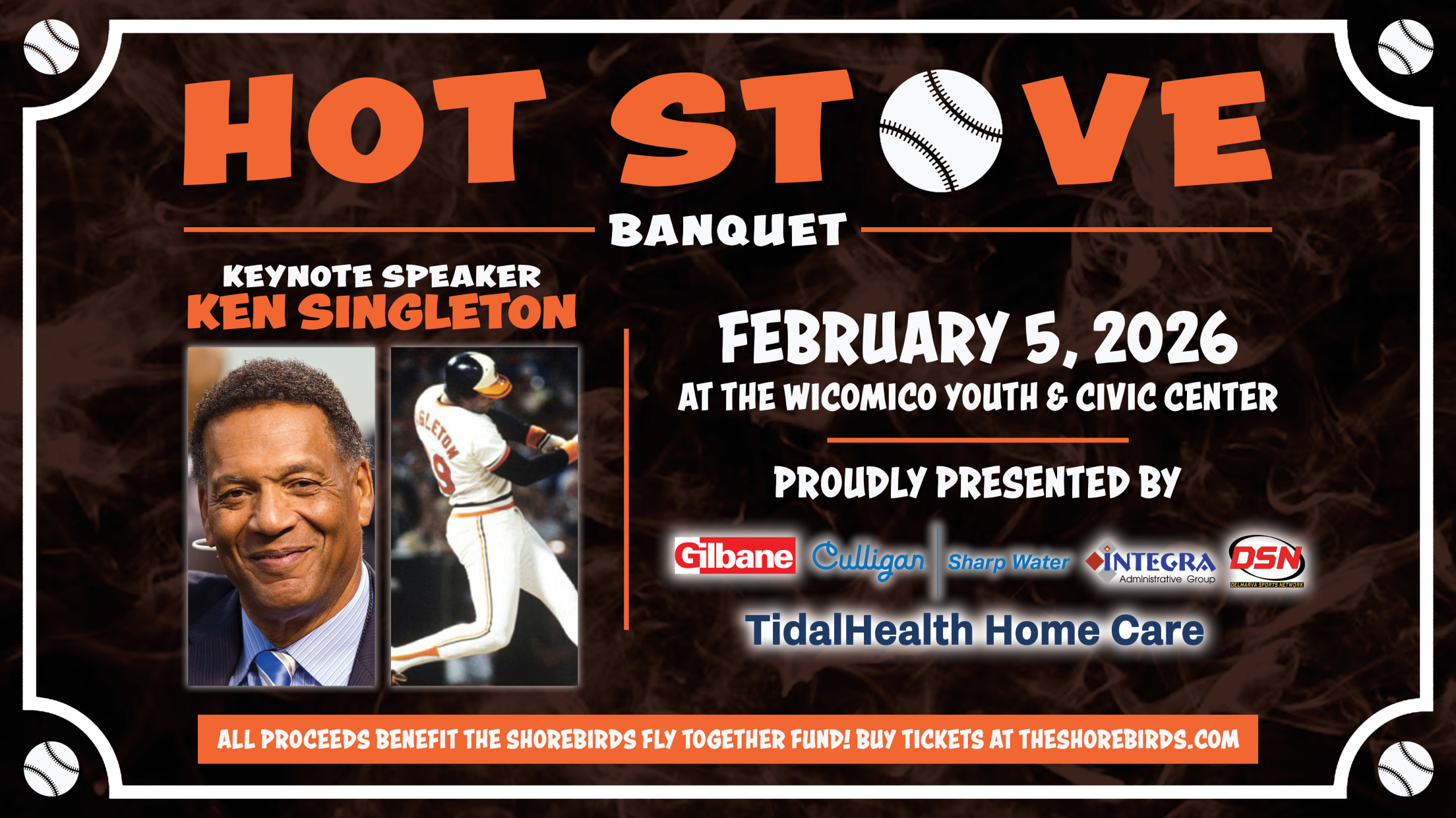 SALISBURY, MD – Baltimore Orioles Hall of Famer Ken Singleton will serve as the featured guest at the Delmarva Shorebirds’ 23rd annual Hot Stove Banquet presented by DSN, Gilbane Building Company, Sharp Water Culligan, and TidalHealth Home Care. The event will be held at the Wicomico Youth and Civic Center in Salisbury, Maryland on Thursday, February, 5th, 2026.