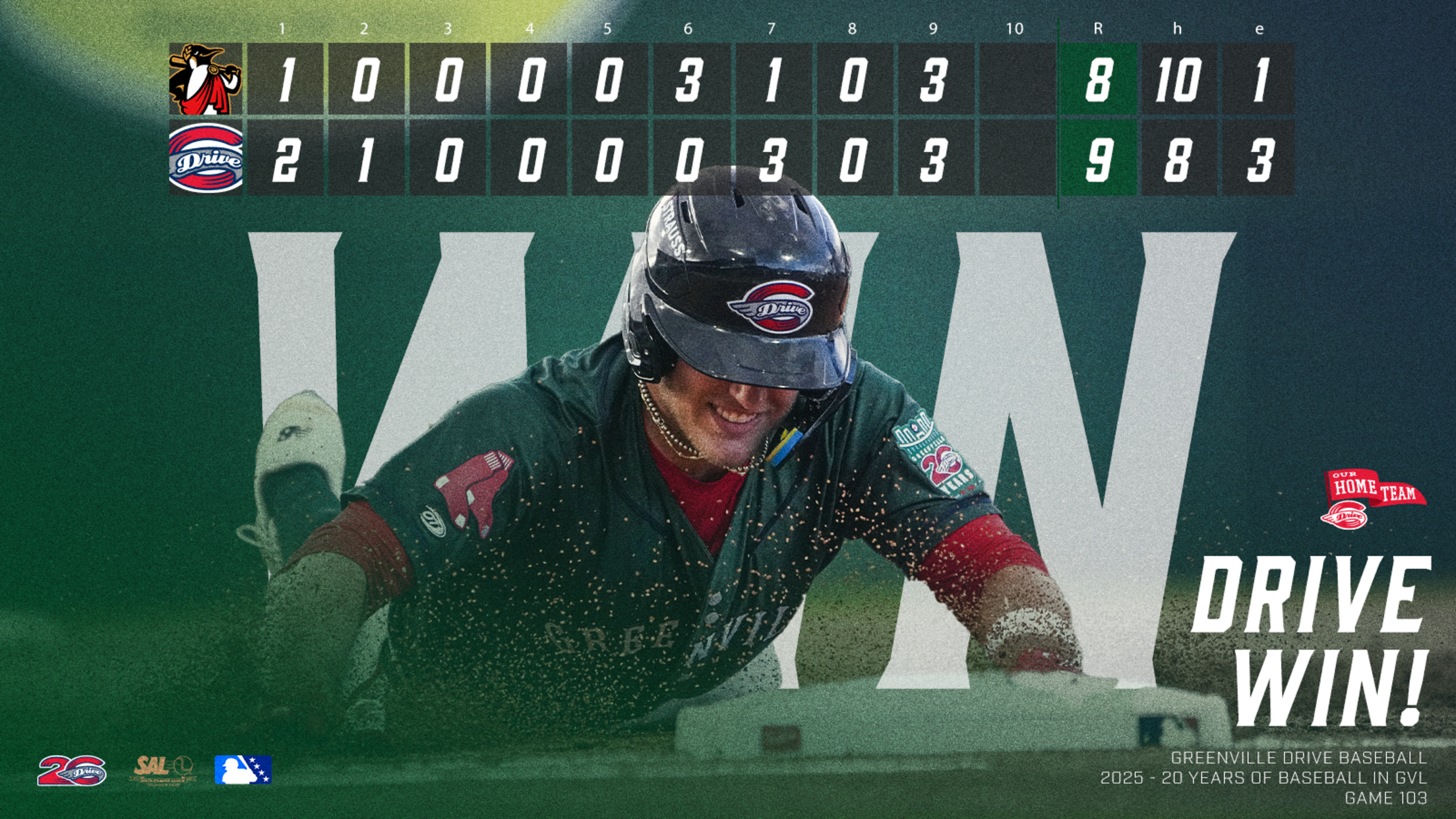 Drive Walk It Off in Wild 9-8 Comeback Win Over Rome GREENVILLE, S.C. — In a wild, back-and-forth affair that stretched over three hours and saw 17 combined runs, 18 hits, 23 walks or hit batters, and five errors, the Greenville Drive (52-51) staged a dramatic ninth-inning rally to walk