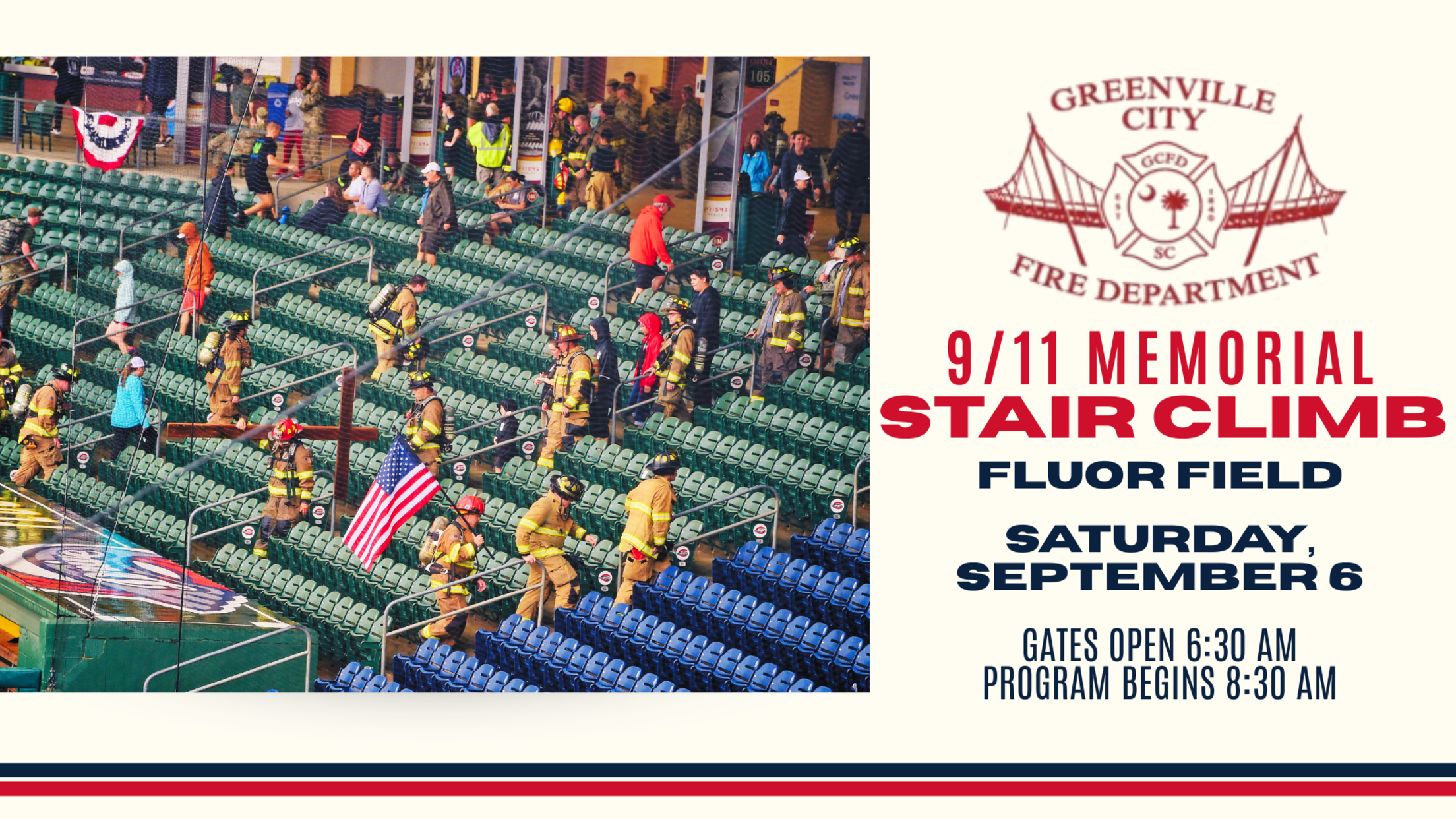 GVL Climbs For Heroes The Greenville City 9/11 Memorial Stair Climb, an annual event to commemorate and honor the FDNY firefighters and first responders who gave their lives on September 11, 2001, returns to Fluor Field on Saturday, September 6th. Gates open at 6:30 AM and opening ceremonies will begin