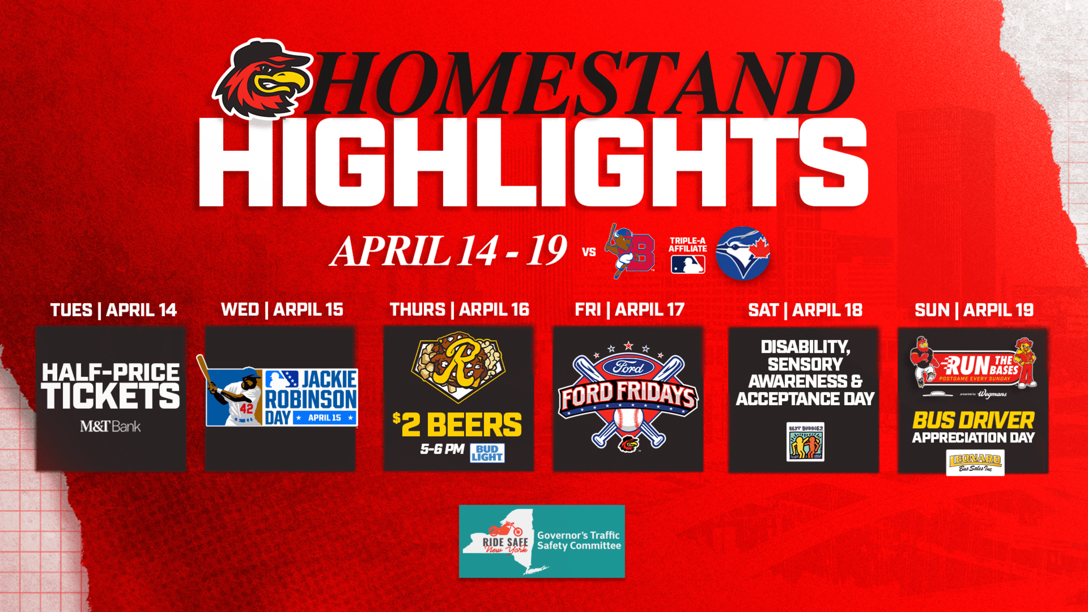 The Red Wings host the Buffalo Bisons (Toronto Blue Jays’ top affiliate) at ESL Ballpark April 14-19. The Homestand Highlights are presented by the New York Governor's Traffic Safety Committee. Tickets for all Red Wings home games are available 24/7 at RedWingsBaseball.com, over the phone at (585) 423-WING (9464), or