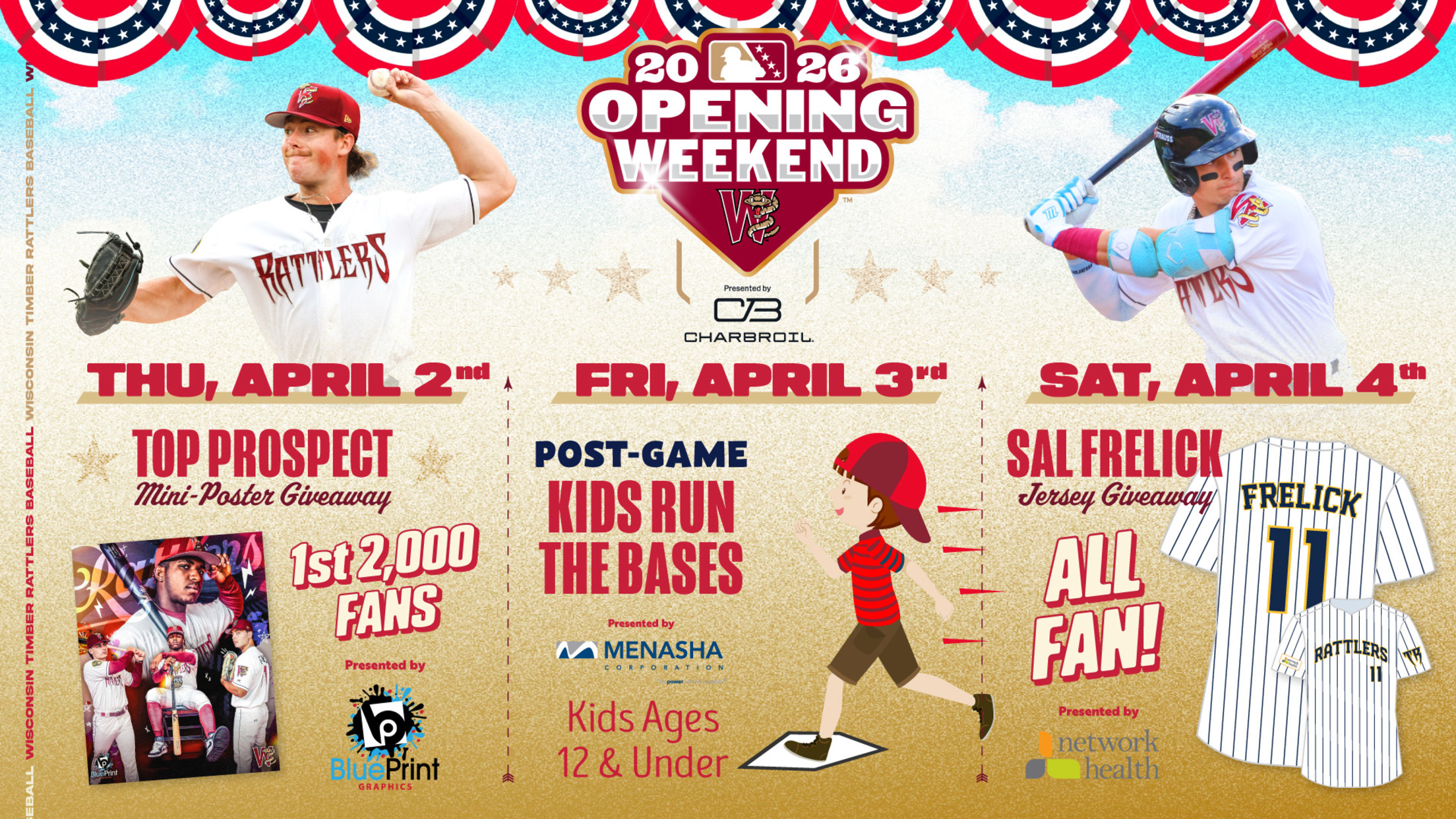 THURSDAY, APRIL 2 at 6:40pm – OPENING NIGHT; Prospect Mini-Poster Giveaway presented by Blue Print Service Company; Craft Brews & Brats presented by Fox River Brewing Company; 2026 Magnet Schedules courtesy of Fox Communities Credit Union: Be one of the first 2,000 fans into the ballpark on Opening Night to receive a special mini-poster of Milwaukee Brewers prospects from Blue Print Service Company. Everyone can enjoy Brats from Salmon’s Meat Products and Celsius Mocktails for $3. All craft beers are available to fans of the legal drinking age for $3 from Fox River Brewing Company. After the game, there will be Magnet Schedules for the 2026 season courtesy of Fox Communities Credit Union available on your way out of the stadium.