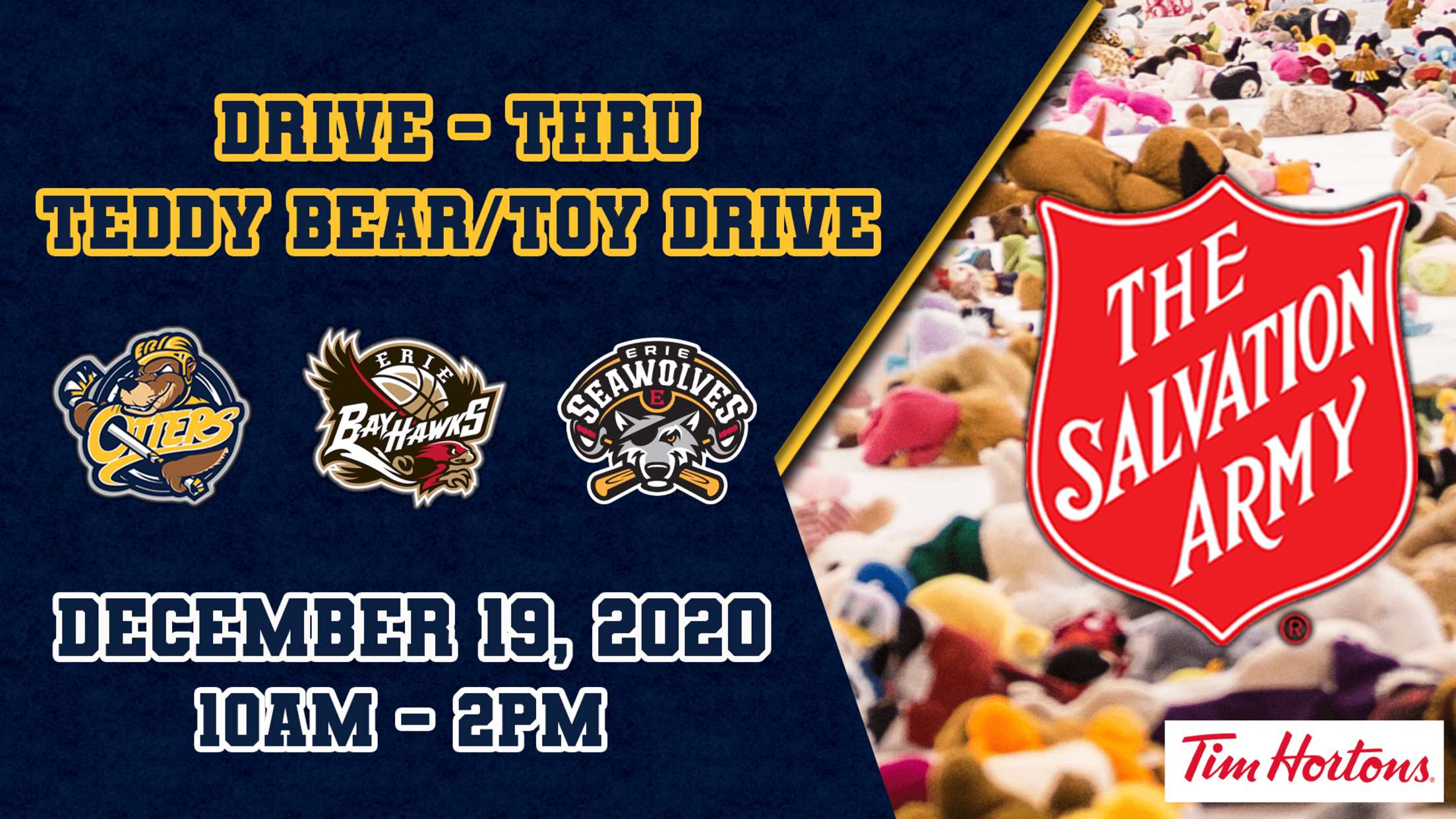 The Erie SeaWolves, Erie Otters, and Erie BayHawks are teaming up to host a contactless drive-thru teddy bear toss and toy collection benefitting the Salvation Army of Erie on Saturday, December 19th from 10am-2pm.