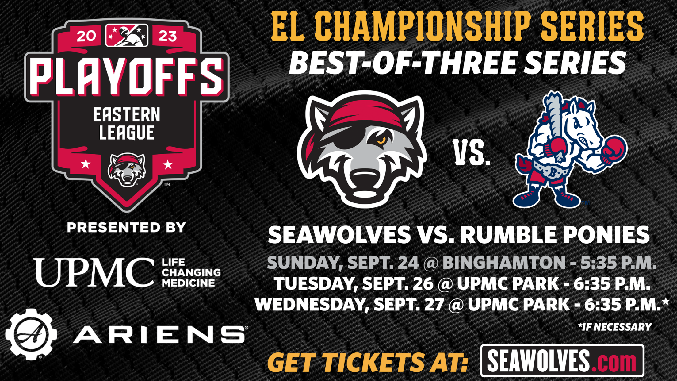 The SeaWolves have advanced to a second straight Eastern League Championship Series and will take on the Binghamton Rumble Ponies in a best-of-three series beginning on Sunday, September 24. The 2023 Eastern League Playoffs are presented by UPMC & Ariens.