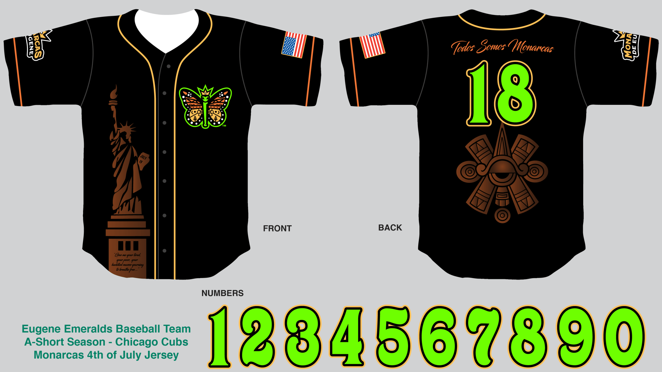 The Emeralds will transform to their alter-image, Los Monarcas de Eugene for the third time as part of six Monarcas Nights throughout the season. The jerseys for the 3rd of July contain multiple odes to the local Latino community, creating a truly unique piece for the season-long celebration. The Statue of Liberty fills the right side of the jersey, along with the famous last lines of the New Colossus sonnet. The Aztec Ollin symbol (pronounced all-in) dons the back of the jersey underneath the player number, representing the heart and commitment of the team. Tying everything together are the words "Todos Somos Monarcas," meaning "We are all Monarchs" and symbolizing unity, which will be on the top back side of the jersey. Along with the special jerseys, the players and coaches will also be wearing Stars and Stripes caps for the evening, complete with red, white, and blue.