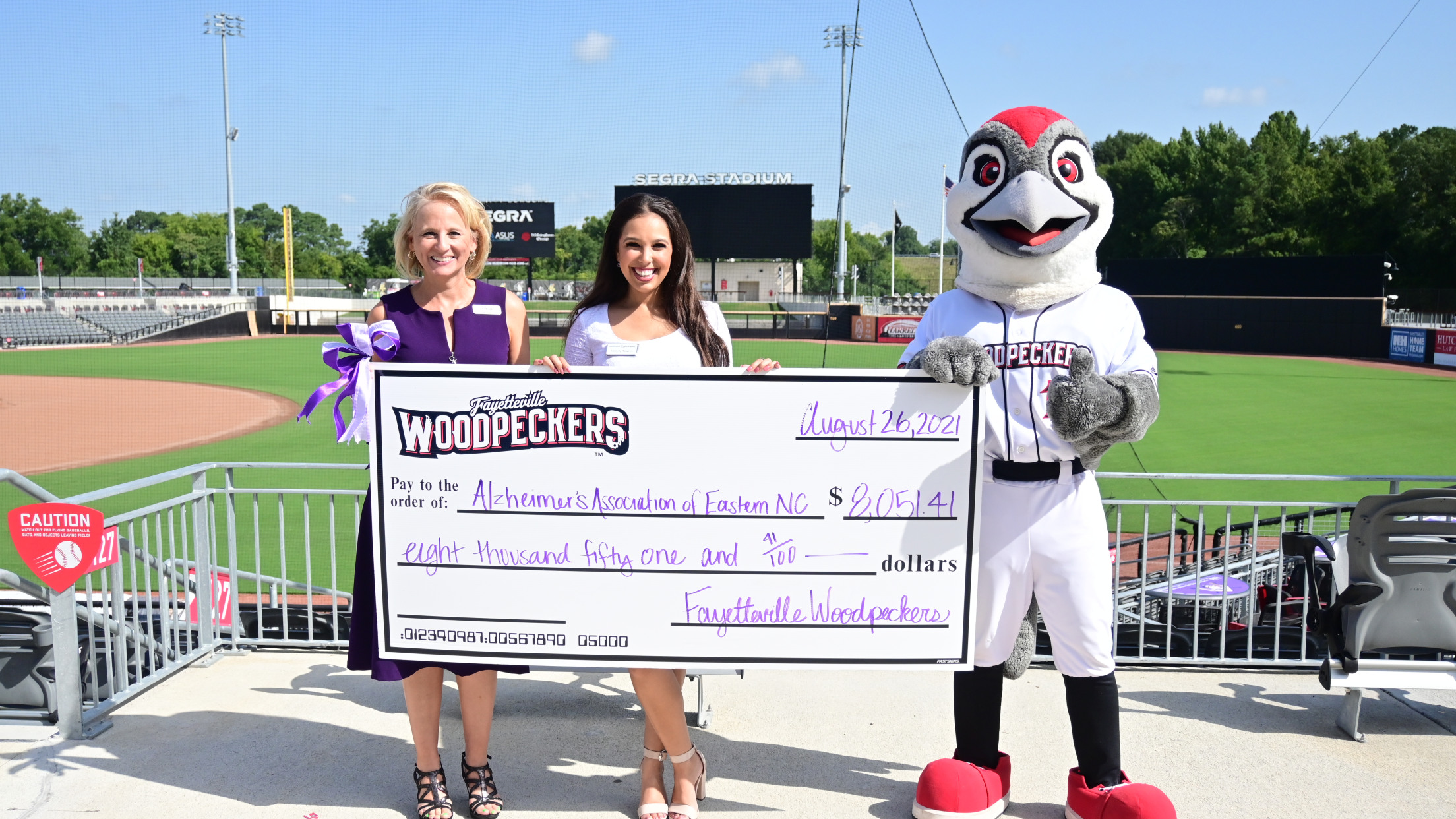 On Saturday, August 7th, the Fayetteville Woodpeckers might have looked unrecognizable, even to the most adoring fans. The Class A affiliate of the Houston Astros traded its signature red, gray and black colors for purple to raise awareness for Alzheimer’s disease. The event, Alzheimer’s Awareness Night, raised $8,051.41 through both an in-person and online auction of the game-worn purple jerseys seen on-field that evening. Proceeds from the jersey auction directly benefitted the Alzheimer’s Association of Eastern North Carolina. The game’s festivities were presented by long-time partner McKee Homes and drew over 4,000 fans to Segra Stadium.