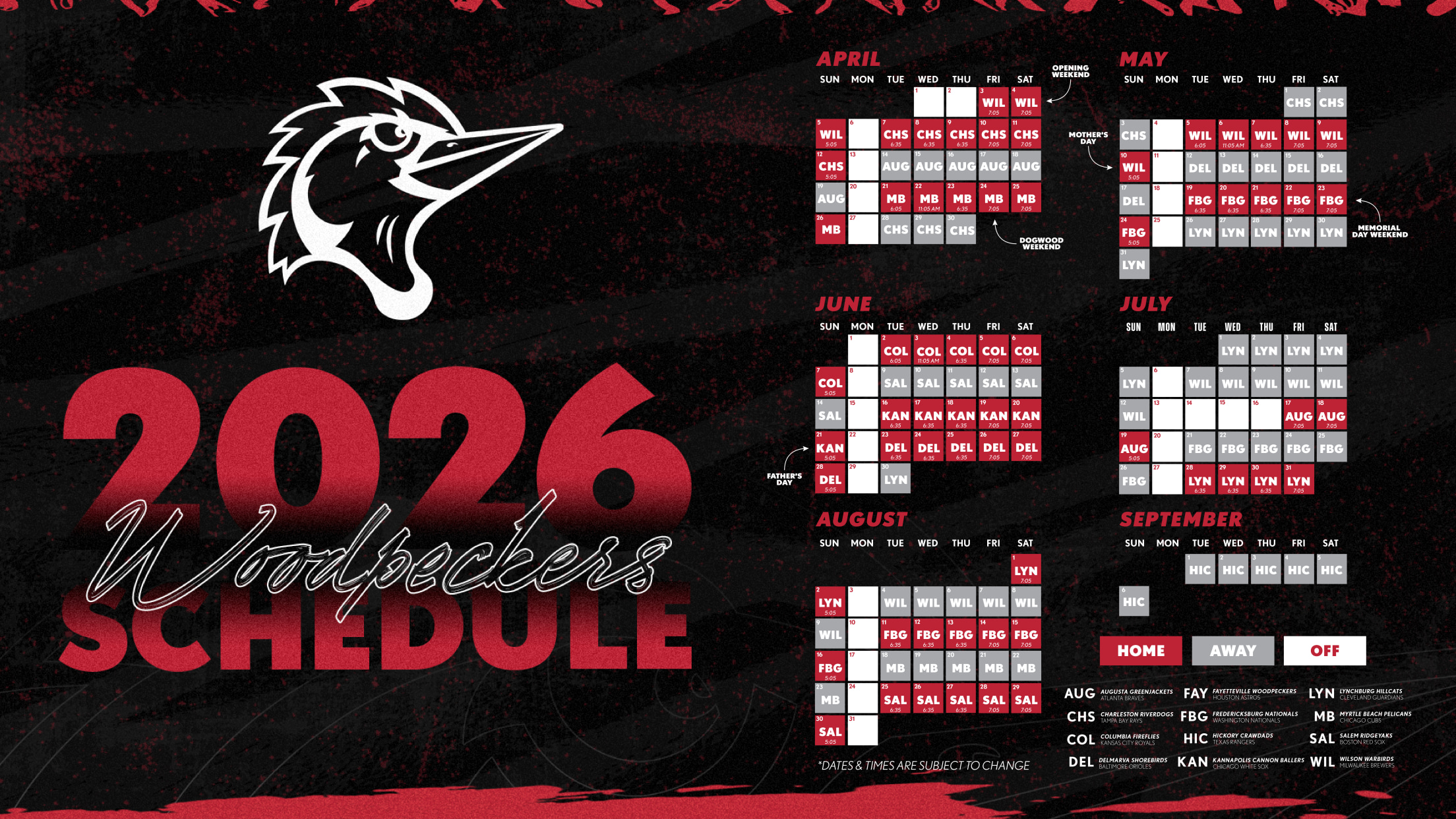 The Fayetteville Woodpeckers announced their start times for the 2026 campaign. Aligning with last season’s game times, the club will start Tuesday through Thursday games at 6:35 p.m., Friday & Saturday games at 7:05 p.m. and Sunday games at 5:05 p.m.