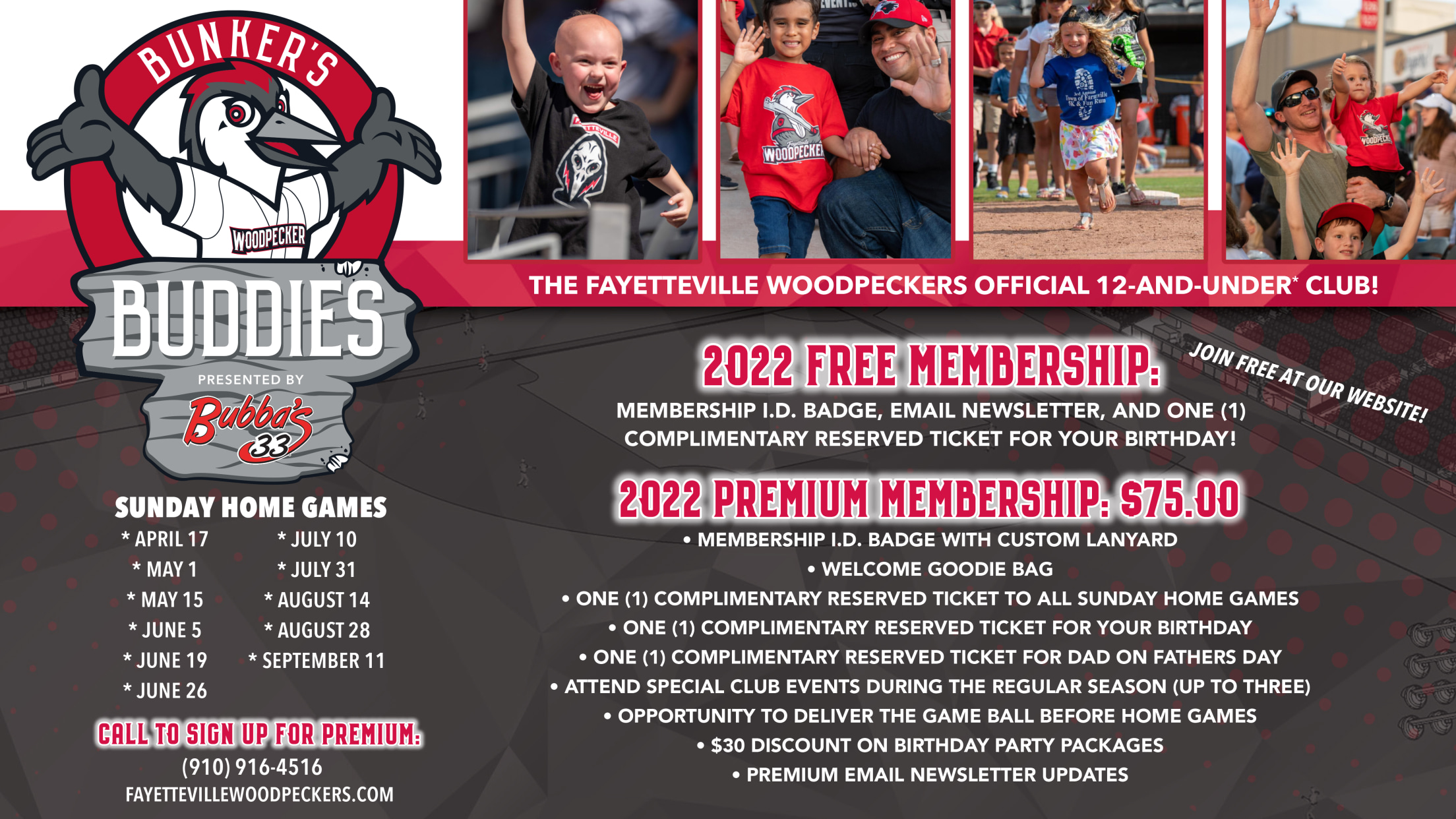 The Fayetteville Woodpeckers announced today the return of their Bunker’s Buddies Kids Club for the 2022 season. The official kids club, presented by Bubba’s 33, will have both a premium and free membership for all children 12 and under.