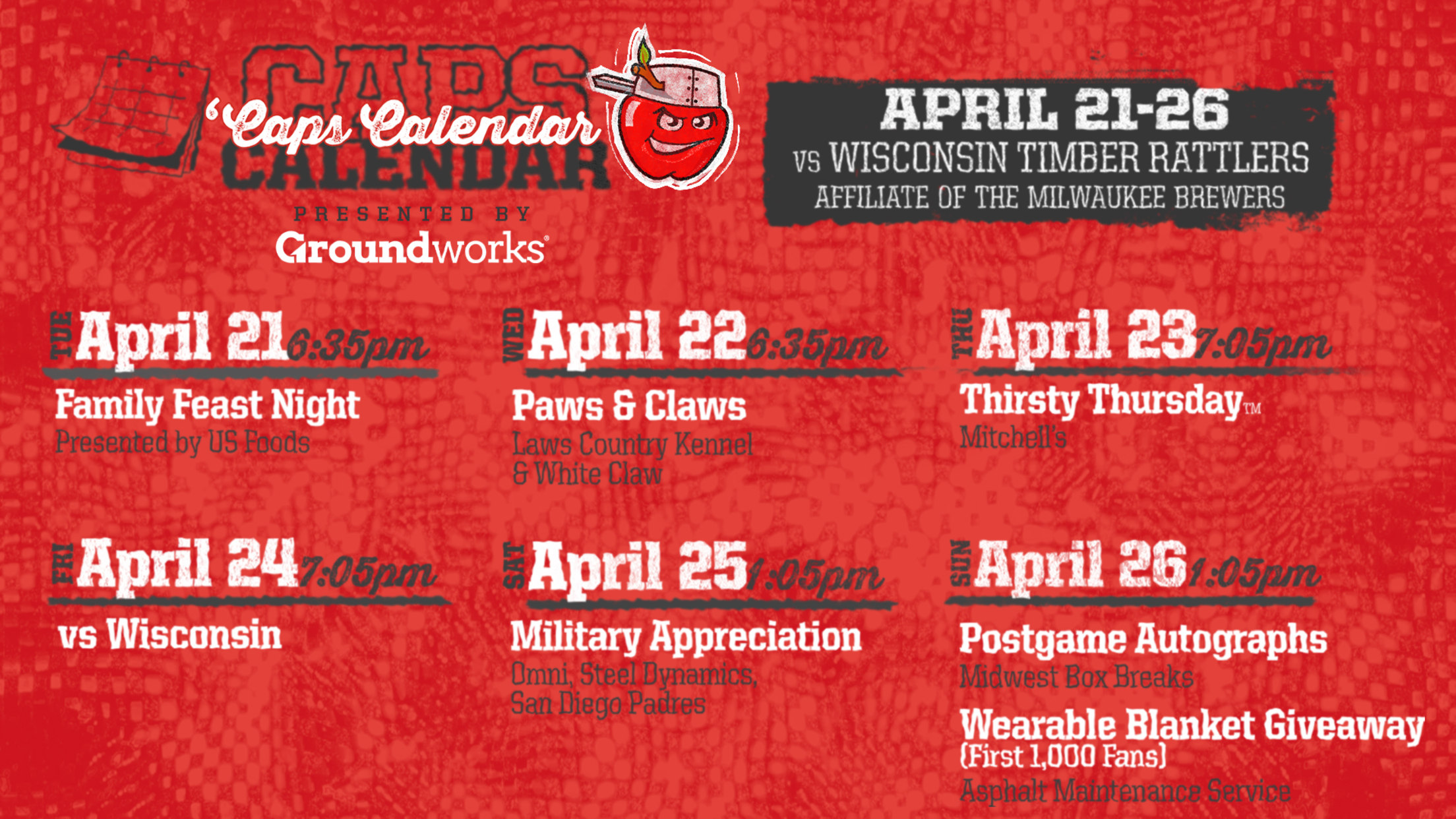 Presented by Groundworks Tuesday, April 21 (6:35pm) - Family Feast Night presented by US Foods: Enjoy concessions from the Value Menu ($5 or less) - TICKETS Wednesday, April 22 (6:35pm) - Paws & Claws presented by Law’s Country Kennel: Pets welcome with purchase of “Paw Pass,” and discounted White Claw