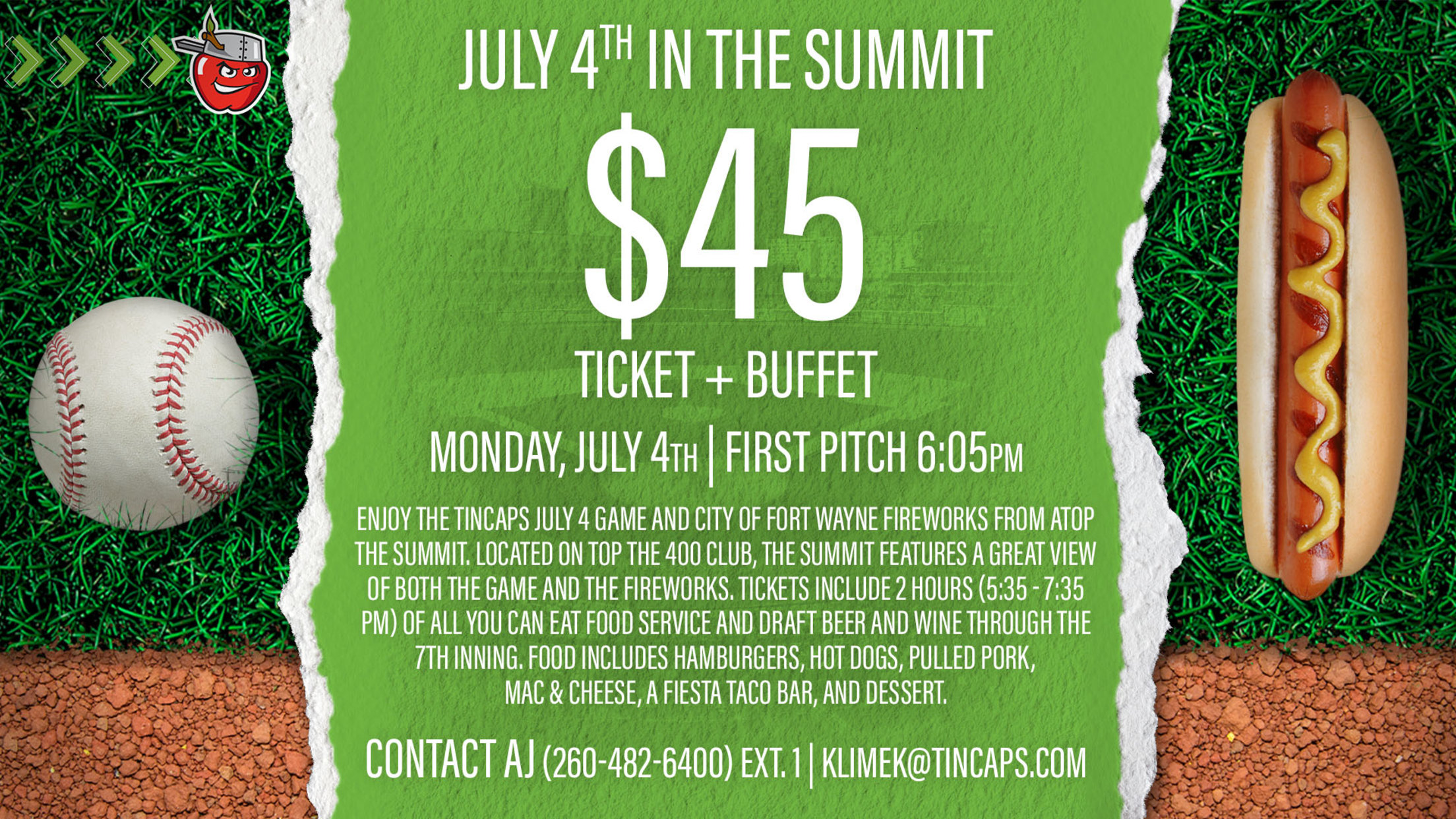"The Summit" at Parkview Field is typically reserved for groups of 20-150 fans. However, for this special occasion, the TinCaps are offering fans the unique chance to purchase a $45 ticket to "The Summit" that also comes with a two-hour buffet (5:35-7:35 p.m.), featuring all-you-can-eat food service as well as draft beer and wine through the seventh inning of the game. The buffet includes hamburgers, hot dogs, pulled pork, mac and cheese, a taco bar, and dessert.