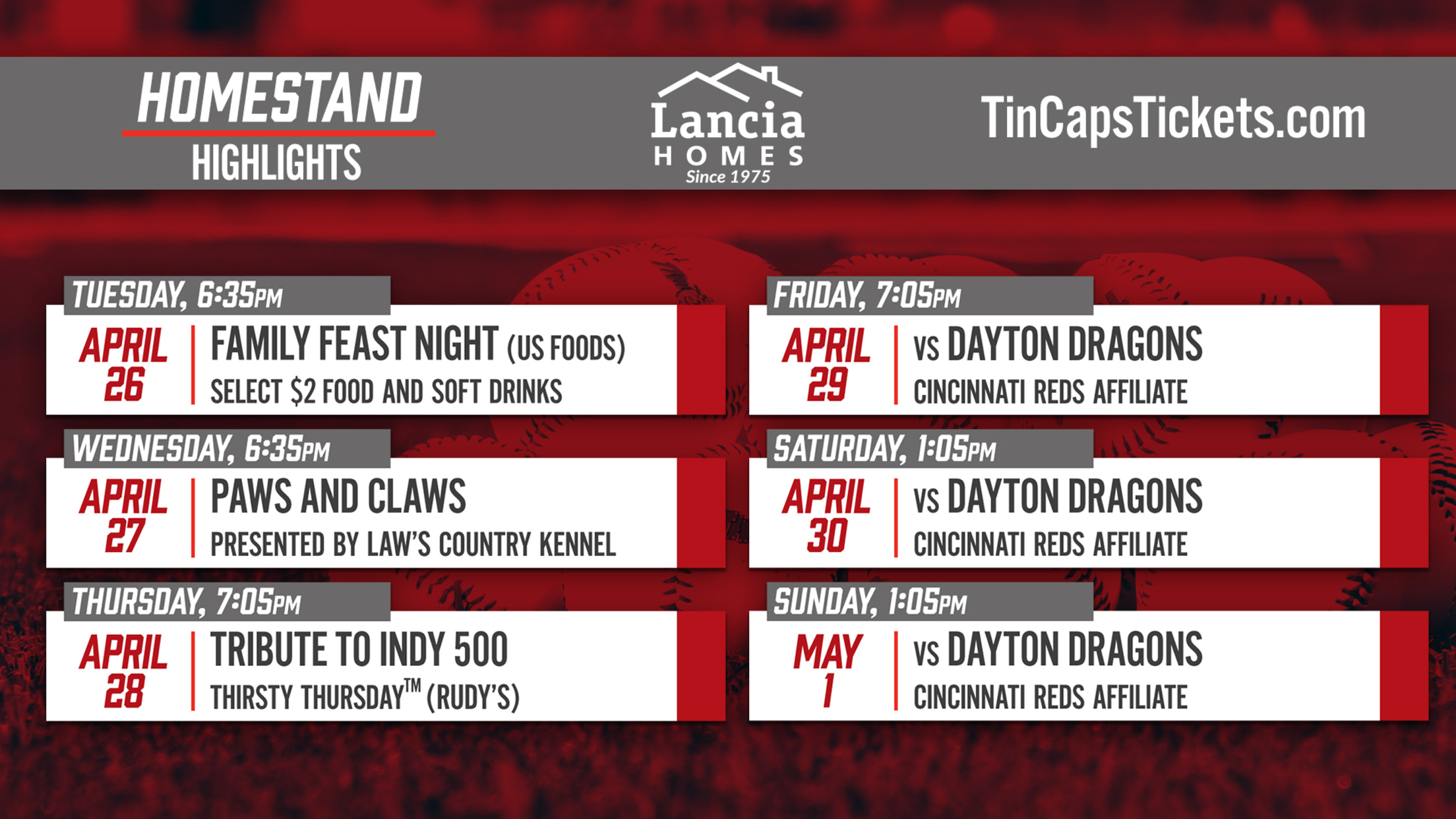Tuesday, April 26, 6:35 p.m. - vs. Dayton Dragons (Cincinnati Reds affiliate) - Family Feast Night presented by US Foods - $2 select concession items - Giveaway: 2022 TinCaps Magnet Schedule presented by Freschetta - TICKETS Wednesday, April 27, 6:35 p.m. - vs. Dayton Dragons (Cincinnati Reds affiliate) - Paws