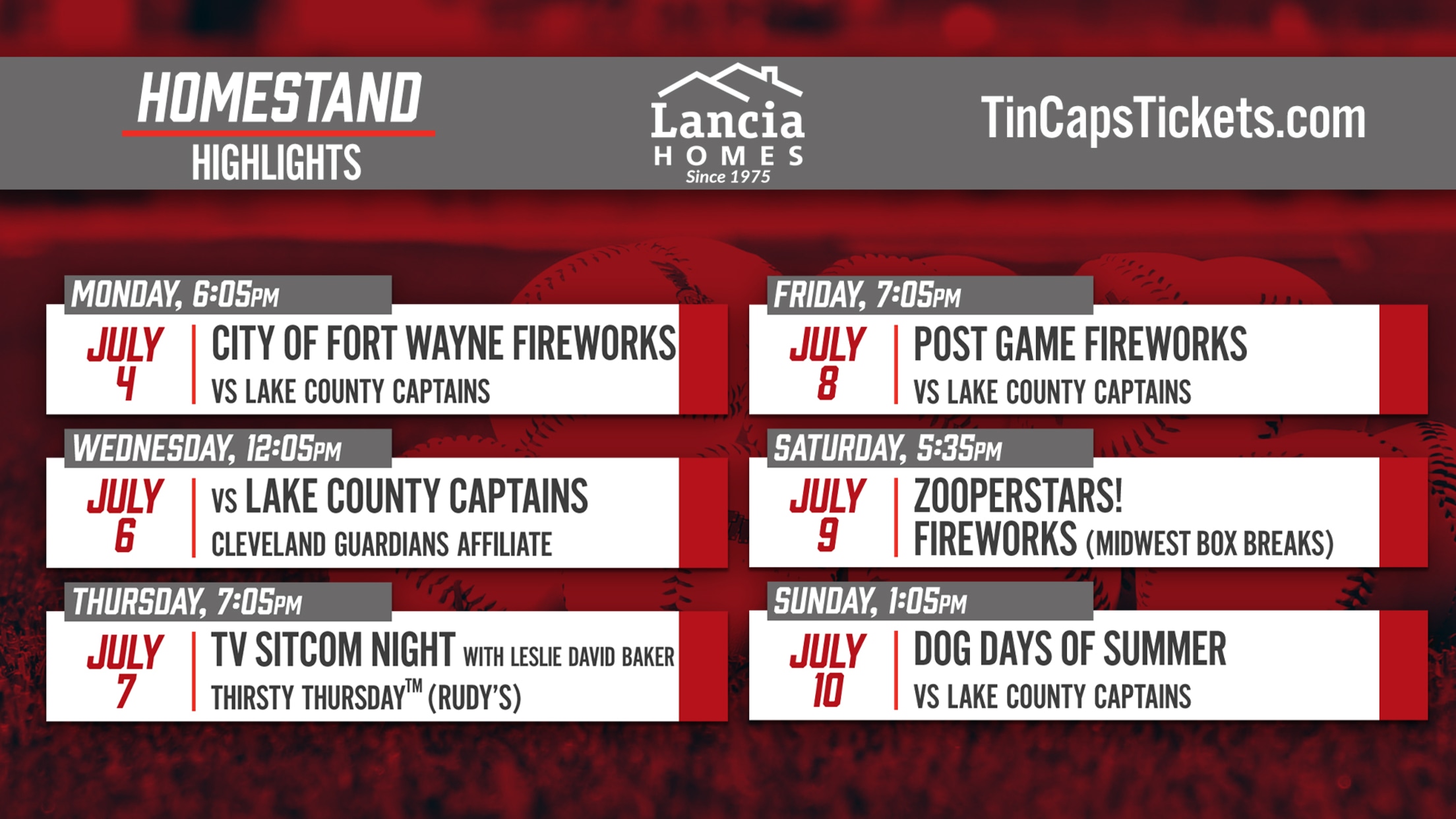 vs. Lake County Captains (Cleveland Guardians affiliate) Monday, July 4, 6:05 p.m. - CITY OF FORT WAYNE FIREWORKS! - Patriotic Jersey Auction supporting Honor Flight Northeast Indiana - TICKETS ----- Wednesday, July 6, 12:05 p.m. - 1st midweek matinee since 2019 - TICKETS ----- Thursday, July 7, 7:05 p.m. -