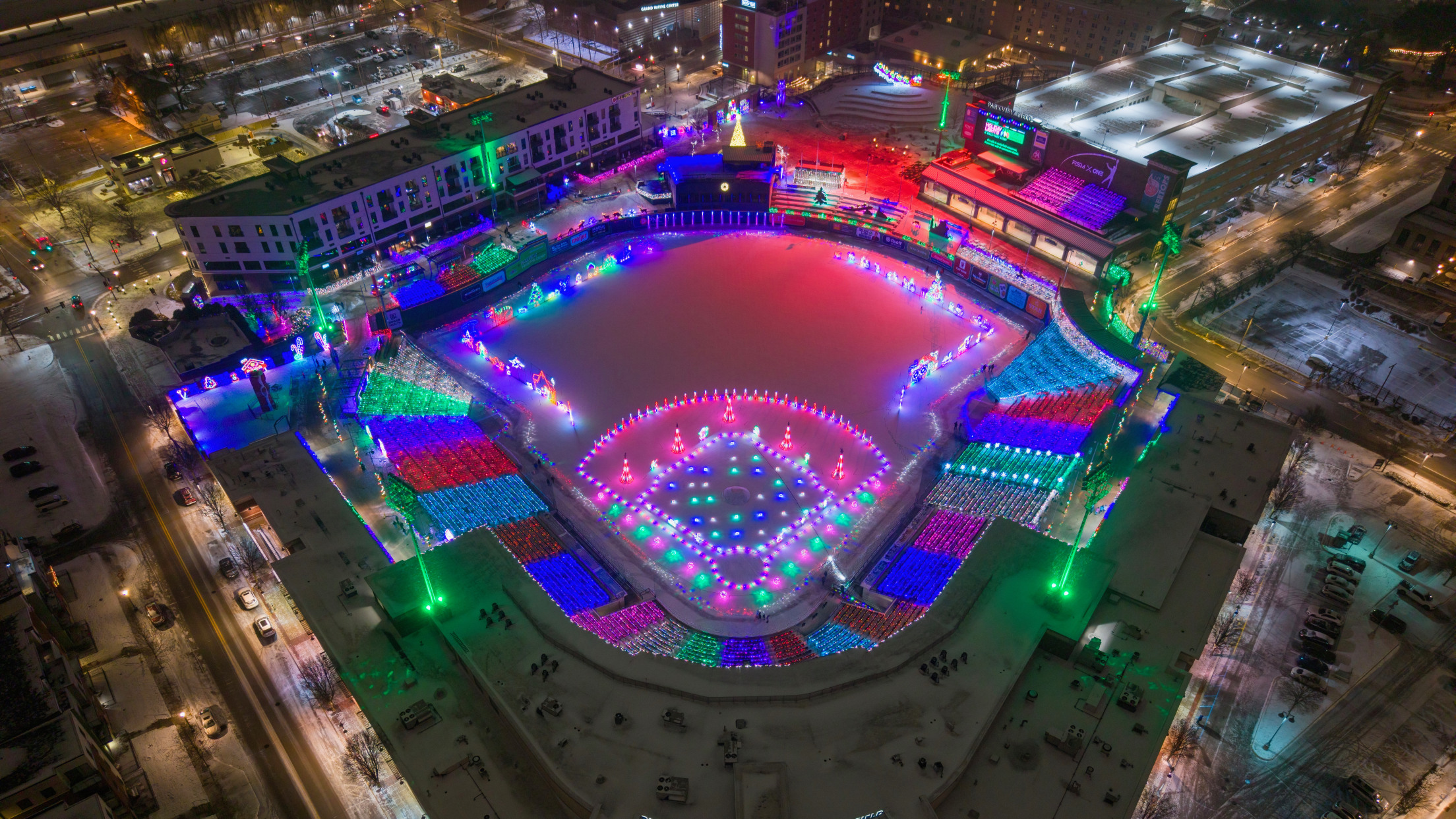 The award-winning ballpark was decorated with more than 1 million lights on display, synchronized to holiday music. Not only were guests able to walk around the concourse to see the spectacle, they were also invited to walk around the field surface. The “Holiday Express” electric train ride around the concourse was highly popular. Parkview Field also offered a free craft room for kids featuring activities like writing letters to Santa, equipped with a mailbox to send off to the North Pole. There was a free digital scavenger hunt as well. Guests could also roast s’mores at fire pits located in the outfield concourse. The concessions showcased holiday-themed drinks and desserts. With a giant Christmas tree and Santa’s sleigh, there were many ideal spots for photos. Team mascot Johnny TinCap, dressed as Santa, met with guests every night. Select nights included promotions like discounted concession prices, dogs welcome, a princess meet-and-greet, and a special area for those with sensory challenges. Parking was free.