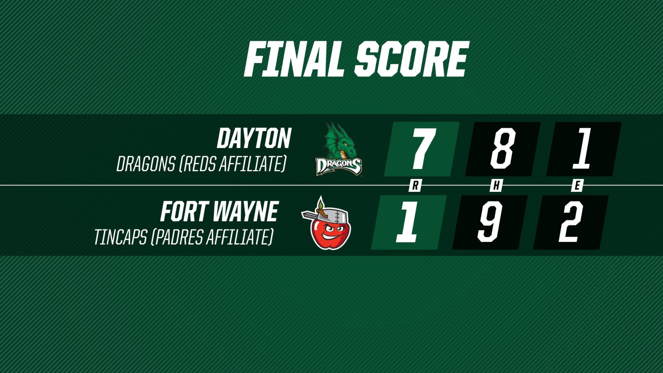 Box Score FORT WAYNE, Ind. - The Fort Wayne TinCaps dropped their homestand finale against the Dayton Dragons (Reds affiliate), 7-1, on Sunday afternoon at Parkview Field in front of a crowd of 6,009 fans. As the designated hitter, Ethan Salas (No. 1 Padres prospect) singled and walked for the
