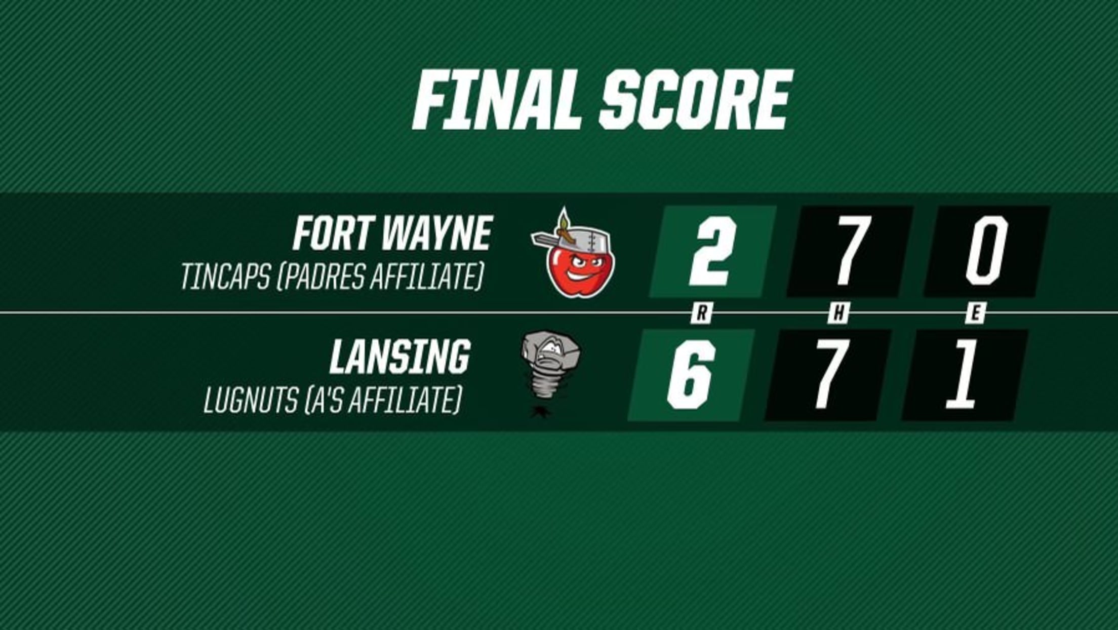 LANSING, MI. – The TinCaps held a one-run lead in the top of the sixth inning but gave up five runs in the bottom half, a deficit the 'Caps couldn't overcome in a 6-2 loss against the Lansing Lugnuts (Oakland A's affiliate) on Thursday night at Jackson Field.