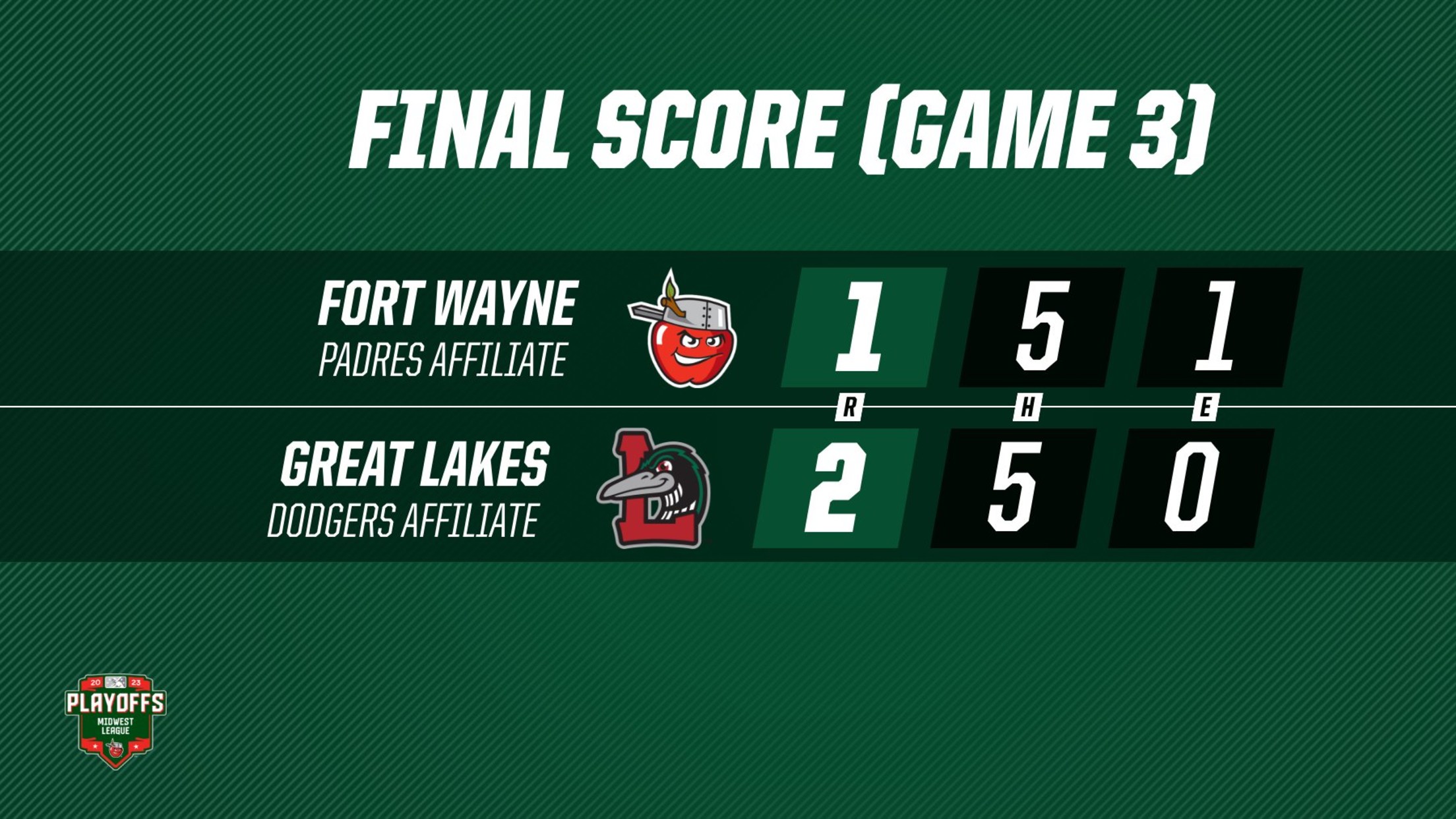 Box Score MIDLAND, Mich. – The Great Lakes Loons (Los Angeles Dodgers affiliate) edged the TinCaps on Friday night, 2-1, at Dow Diamond, ending Fort Wayne’s season. After winning the first game at home, the ‘Caps dropped the final two games of the best-of-three series on the road, both by