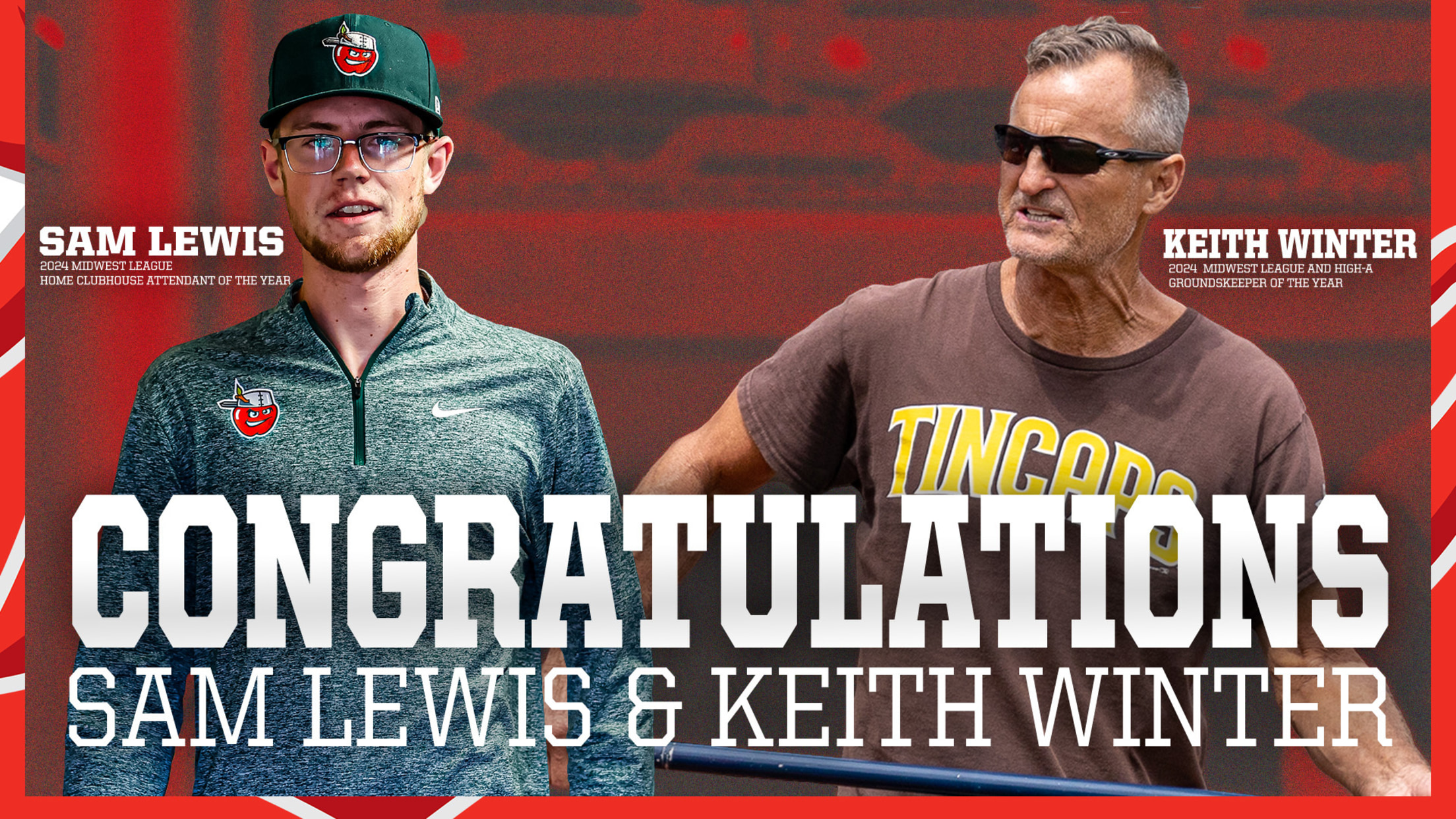 FORT WAYNE, Ind. – Fort Wayne TinCaps head groundskeeper Keith Winter and home clubhouse manager Sam Lewis have been honored by Minor League Baseball. Winter is the 2024 Midwest League Head Groundskeeper of the Year, while Lewis is the 2024 Midwest League Home Clubhouse Manager of the Year. The winners were selected using the results of surveys of league managers, players, and executives throughout the 2024 season.