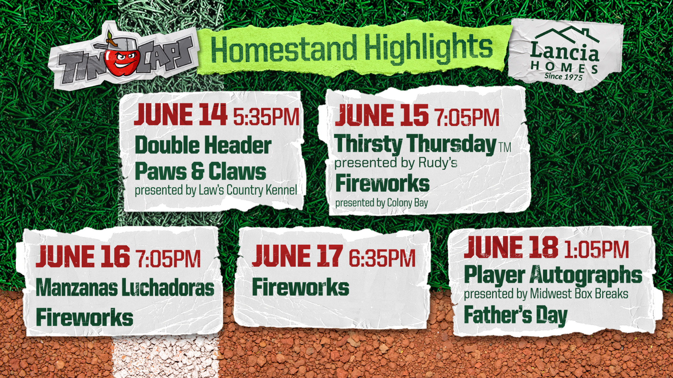 vs. Dayton Dragons (Cincinnati Reds affiliate) Tuesday, June 13 (7:05 p.m.) - Family Feast Night presented by US Foods ($2 hot dogs, pizza slices, popcorn & soft drinks) - Peanut-Free Night (safe environment for those with allergies) - TICKETS ----- Wednesday, June 14 (7:05 p.m.) - Paws & Claws presented