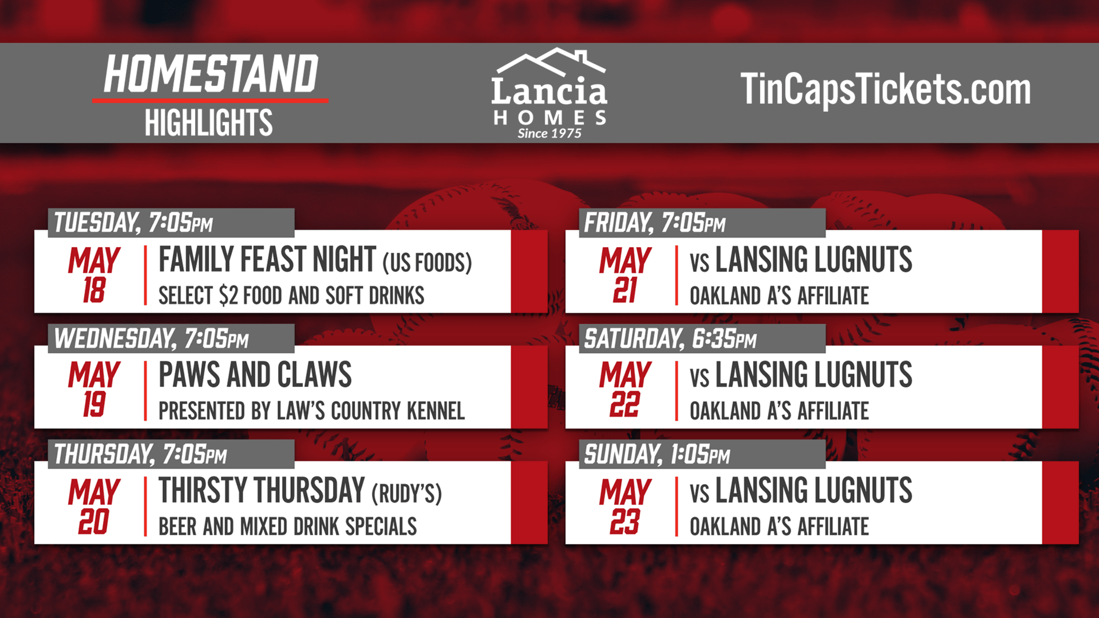 Tuesday, May 18, 7:05 p.m. - vs. Lansing Lugnuts (Oakland Athletics) - Family Feast Night presented by US Foods - $2 concession items - TICKETS Wednesday, May 19, 7:05 p.m. - vs. Lansing Lugnuts (Oakland Athletics) - Paws & Claws Night presented by Laws Country Kennel - Pets welcome (with