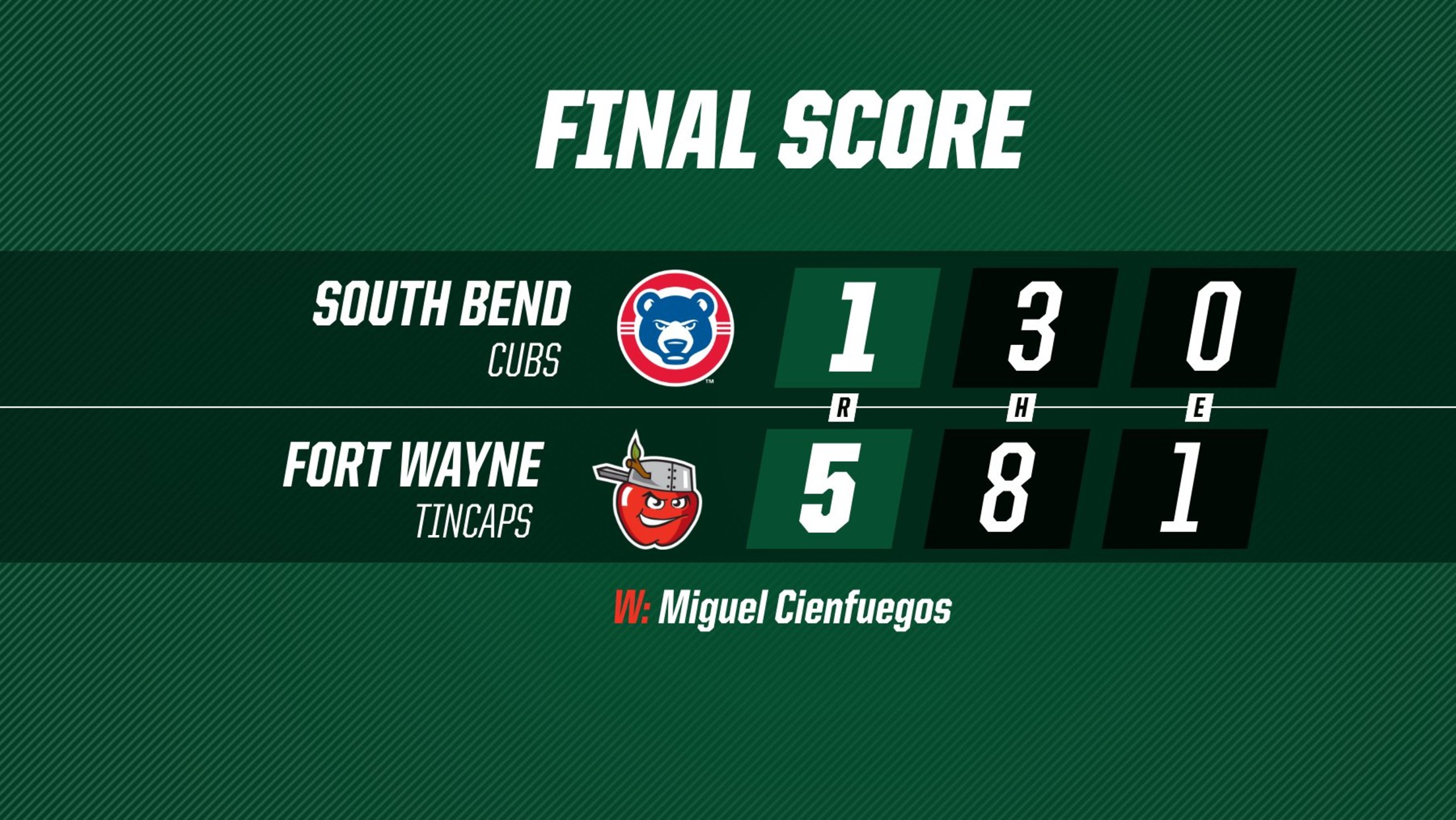 FORT WAYNE, Ind. – The TinCaps took down the Cubs, 5-1, Thursday night at Parkview Field as they received a dominant performance from starter Miguel Cienfuegos.