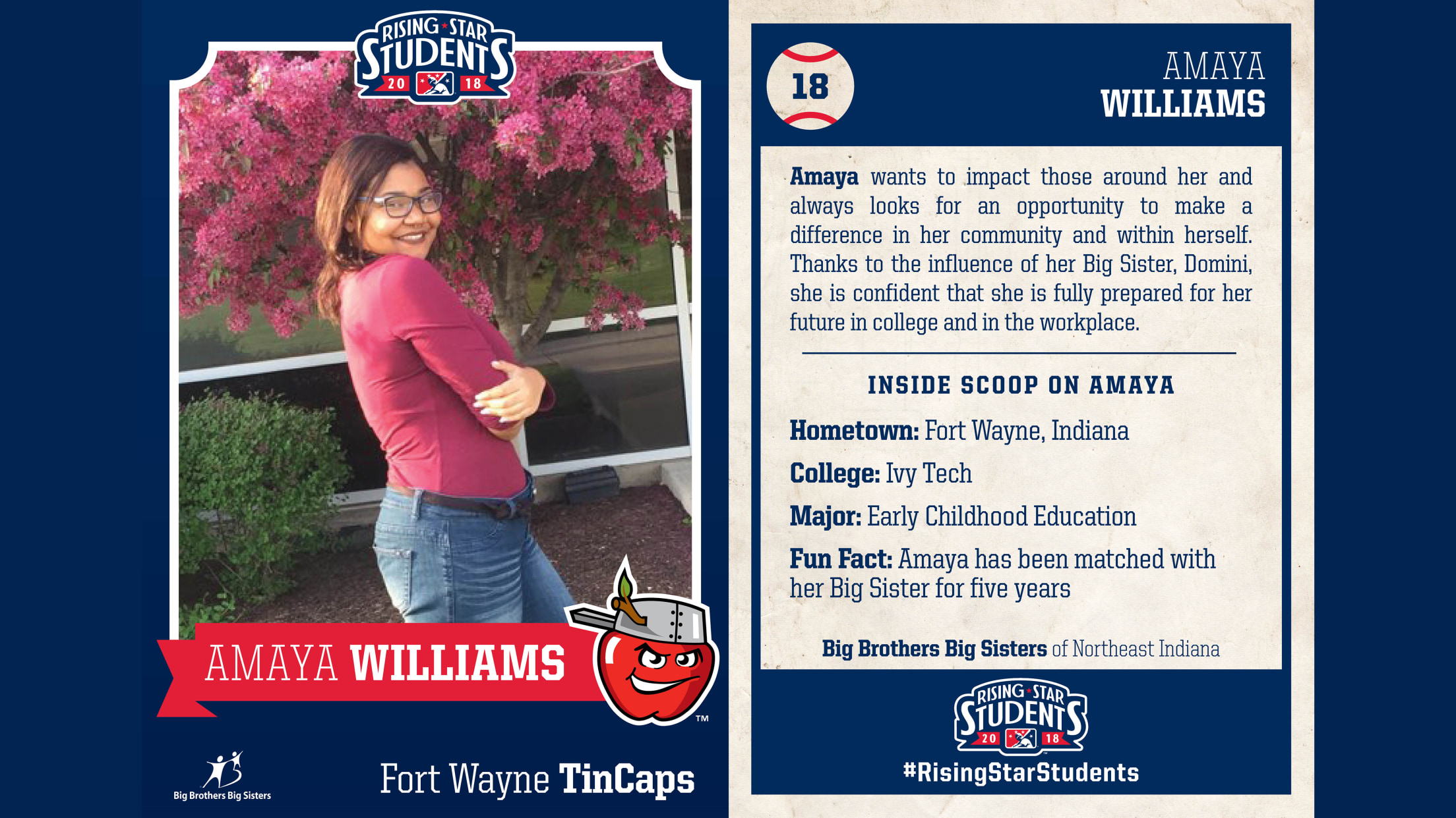 FORT WAYNE, Ind. - The Fort Wayne TinCaps and Big Brothers Big Sisters of Northeast Indiana will recognize Amaya Williams, a local high school senior and one of 20 national Rising Star Students program winners, with an on-field check presentation and a ceremonial first pitch on Friday, June 22 when the team plays the