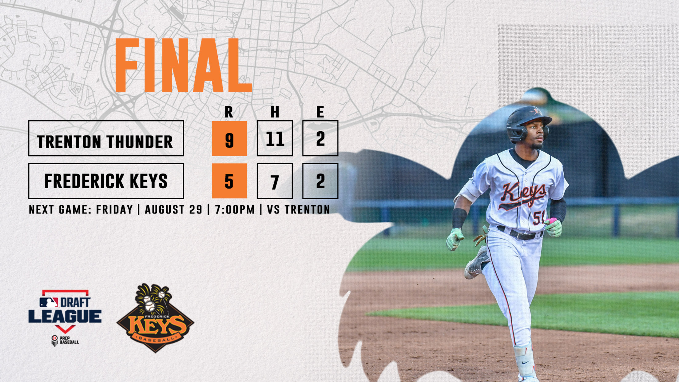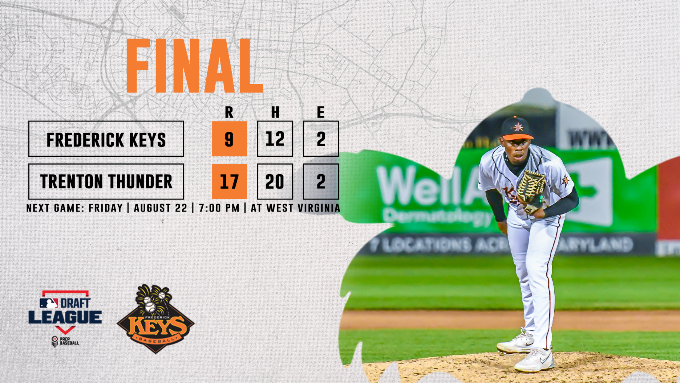 TRENTON, NJ – The Frederick Keys dropped the series finale to the Trenton Thunder Thursday night on the road, falling by a score of 17-9 at Trenton Thunder Ballpark. The Keys could not keep up with the Thunder offense who finished with 20 base hits, as they look to get