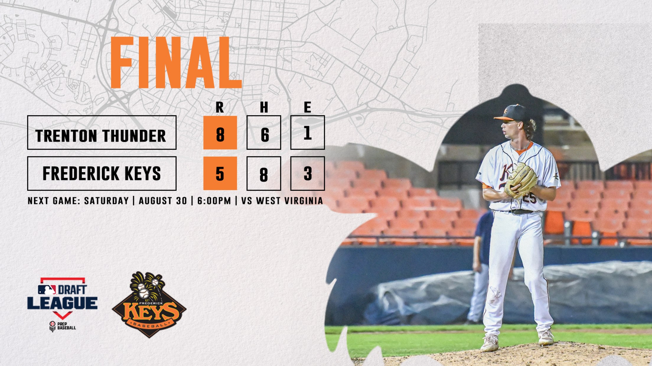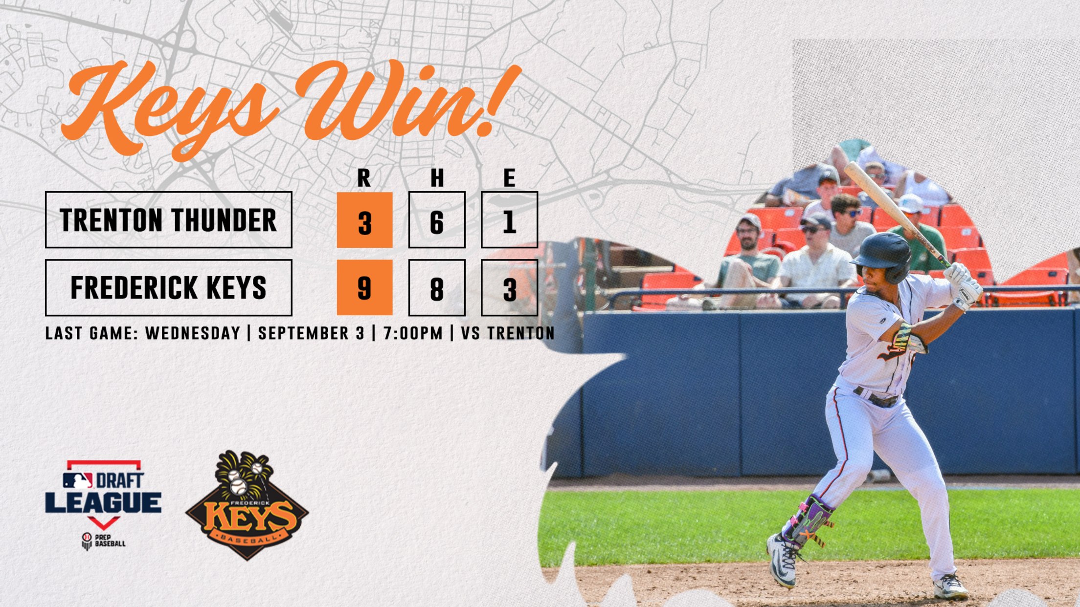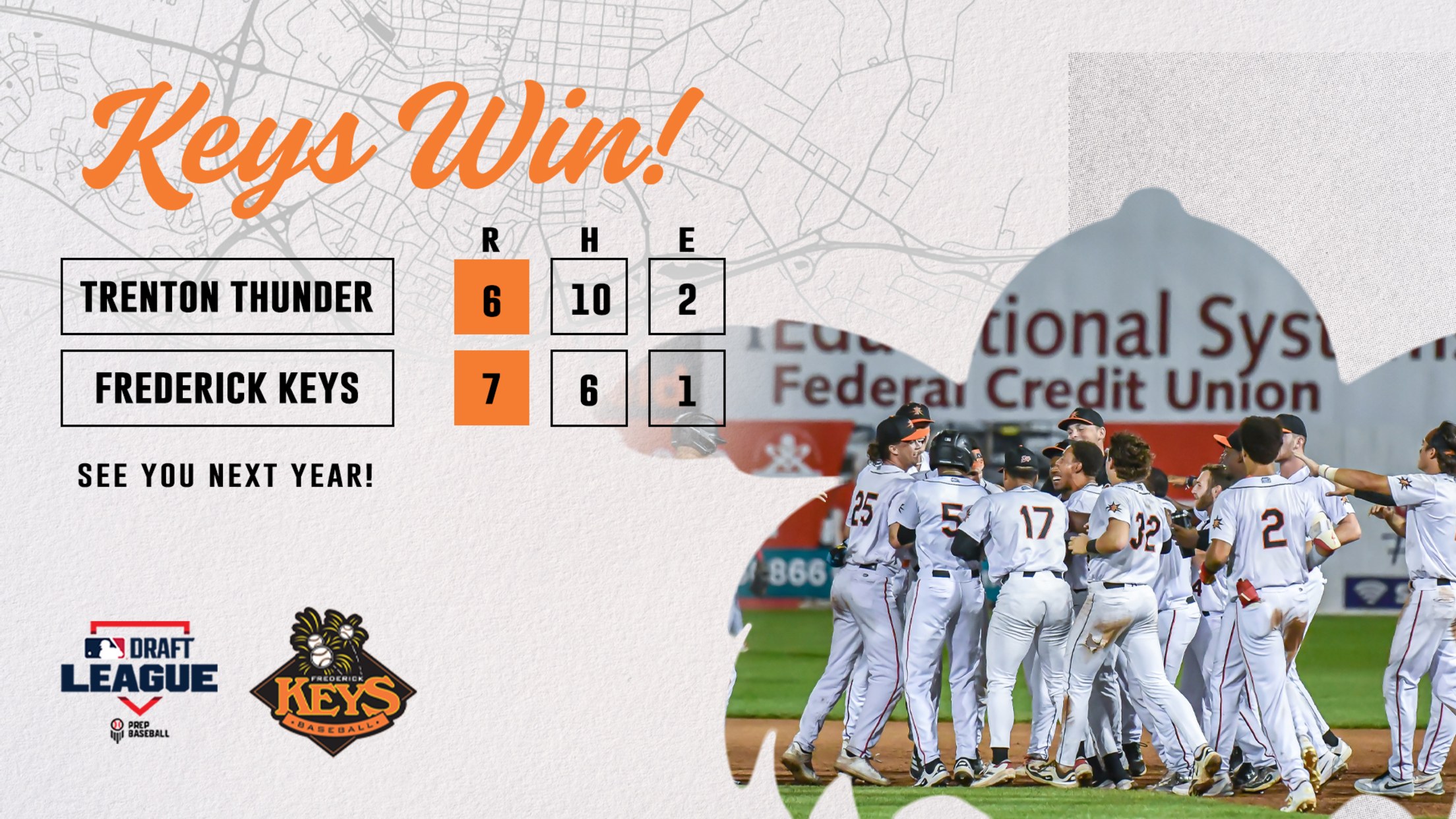 FREDERICK, MD – The Frederick Keys concluded their 2025 season in the series finale against the Trenton Thunder Wednesday night, winning by a score of 7-6 at Nymeo Field at Harry Grove Stadium. The Keys concluded the MLB Draft League era after taking down the Thunder for the third time