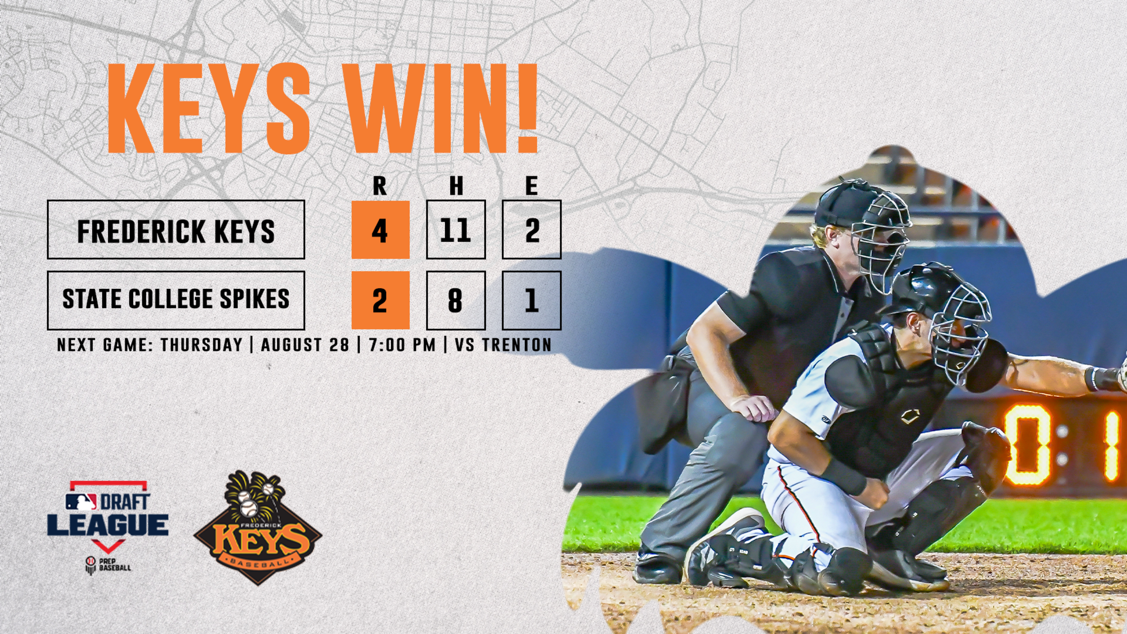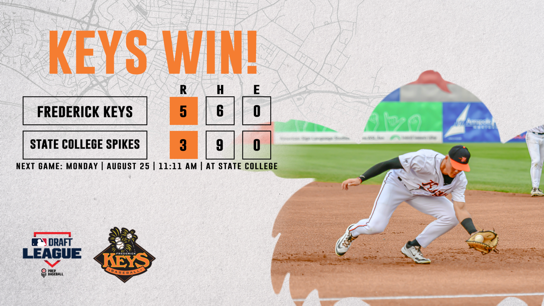STATE COLLEGE, PA – The Frederick Keys took down the State College Spikes in seven innings during the series opener Sunday night, winning by a score of 5-3 at Medlar Field at Lubrano Park. The Keys used a four-run top of the fifth inning to take a 5-3 lead midway