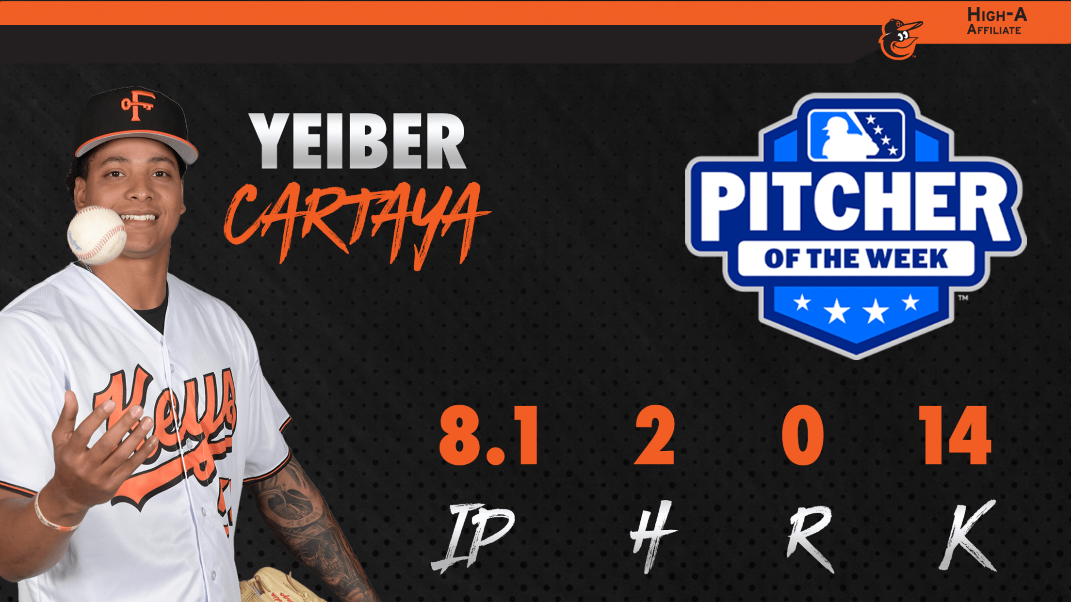 FREDERICK, MD – The South Atlantic League and Minor League Baseball announced Monday that Frederick Keys right-handed pitcher Yeiber Cartaya was named the South Atlantic League Pitcher of the Week for the week ending on Sunday, April 26. Cartaya receives the honor following two scoreless appearances this past week at