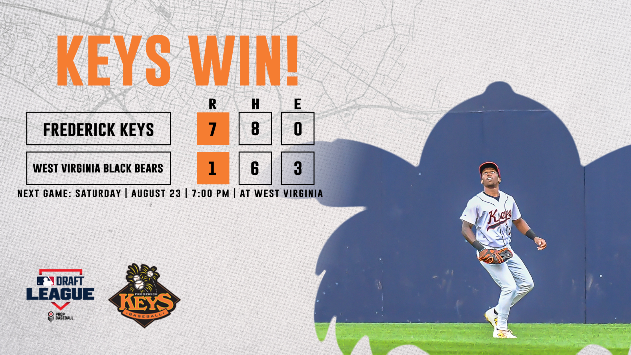 GRANVILLE, WV – The Frederick Keys secured the series opening victory on the road Friday night against the West Virginia Black Bears, winning by a score of 7-1 at Wagener Field at Kendrick Family Ballpark. The Keys scored six straight runs to take a 7-1 lead late into the ballgame,