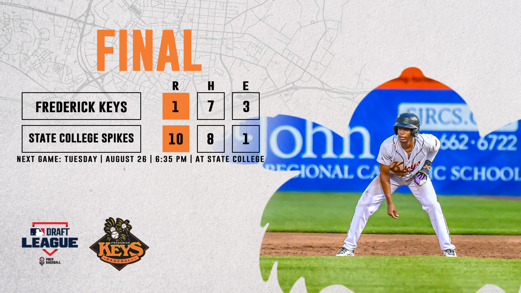 STATE COLLEGE, PA – The Frederick Keys fell in the second game of a three-game series to the State College Spikes Monday afternoon, losing by a score of 10-1 at Medlar Field at Lubrano Park. The Spikes scored three runs in the bottom of the seventh and took a late