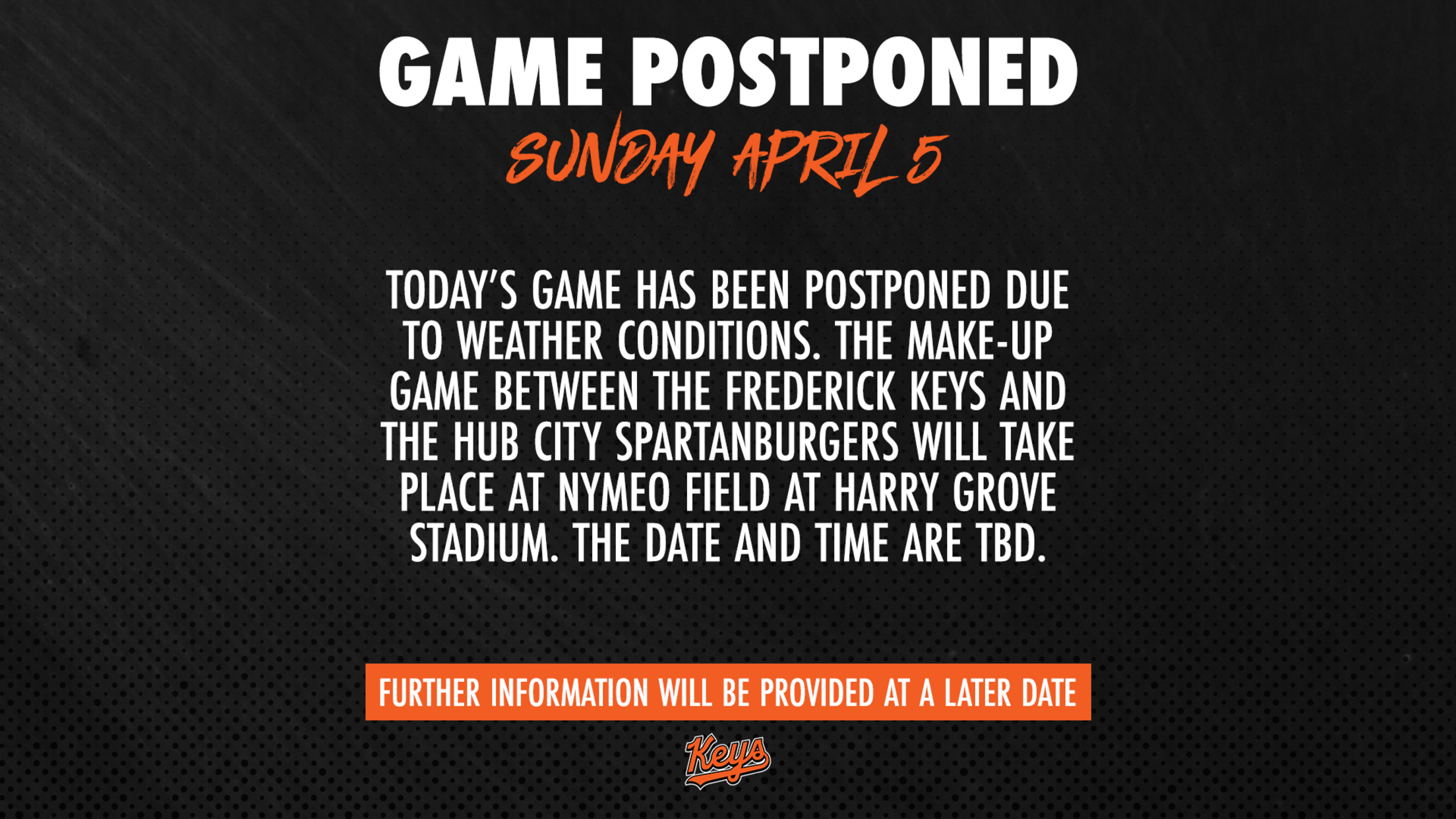 SPARTANBURG, SC – The series finale between the Frederick Keys and Hub City Spartanburgers got postponed Sunday afternoon due to inclement weather at Fifth Third Park. The game was originally scheduled for a 2:05 p.m. first pitch but now will get made up in Frederick at Nymeo Field with a date and time to be determined. Fans are asked to stay tuned to social media and frederickkeys.com for more information.