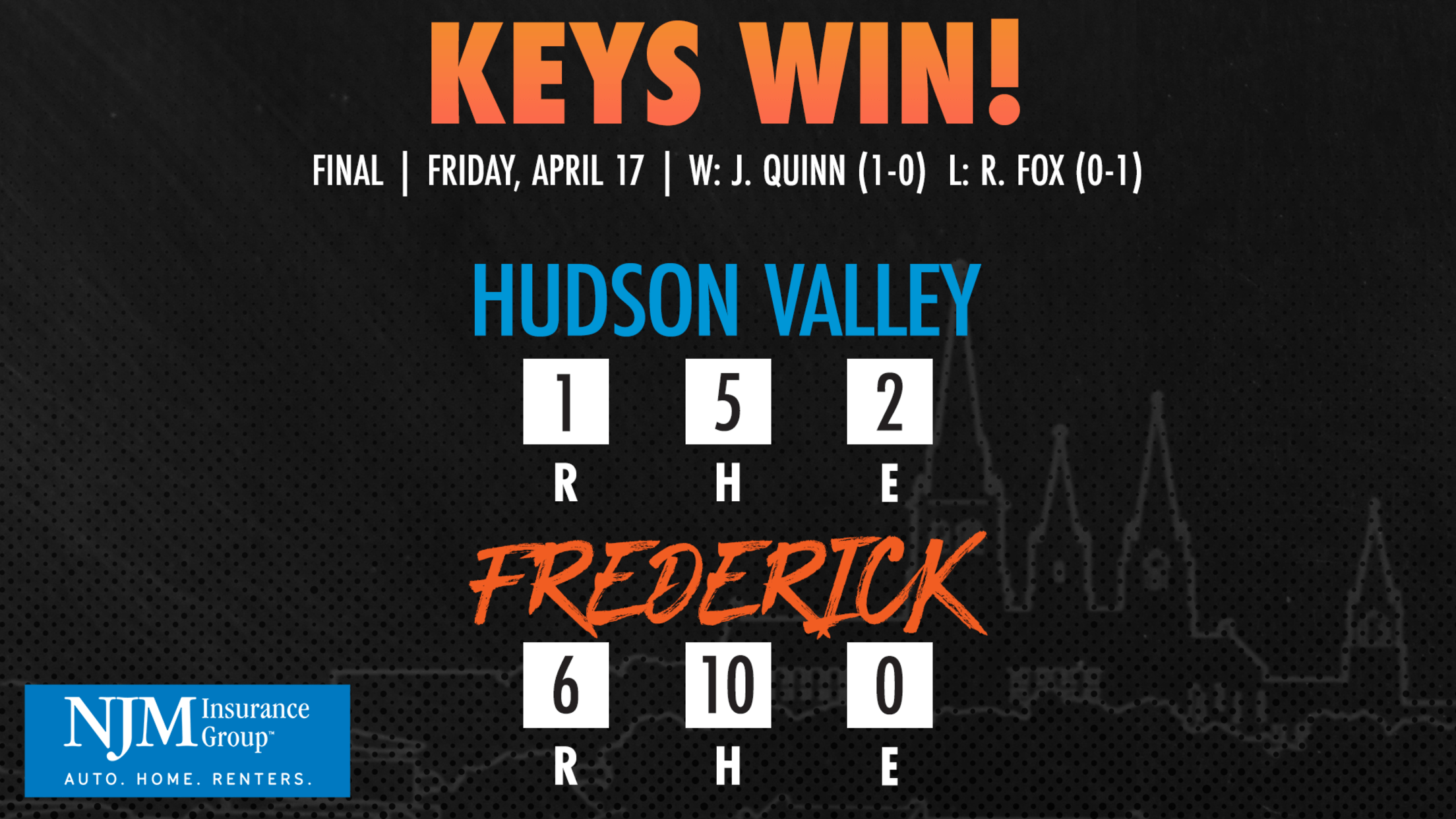 FREDERICK, MD – The Frederick Keys got their first home victory of the 2026 season Friday night, defeating the Hudson Valley Renegades (Yankees) by a score of 6-1 at Nymeo Field at Harry Grove Stadium.