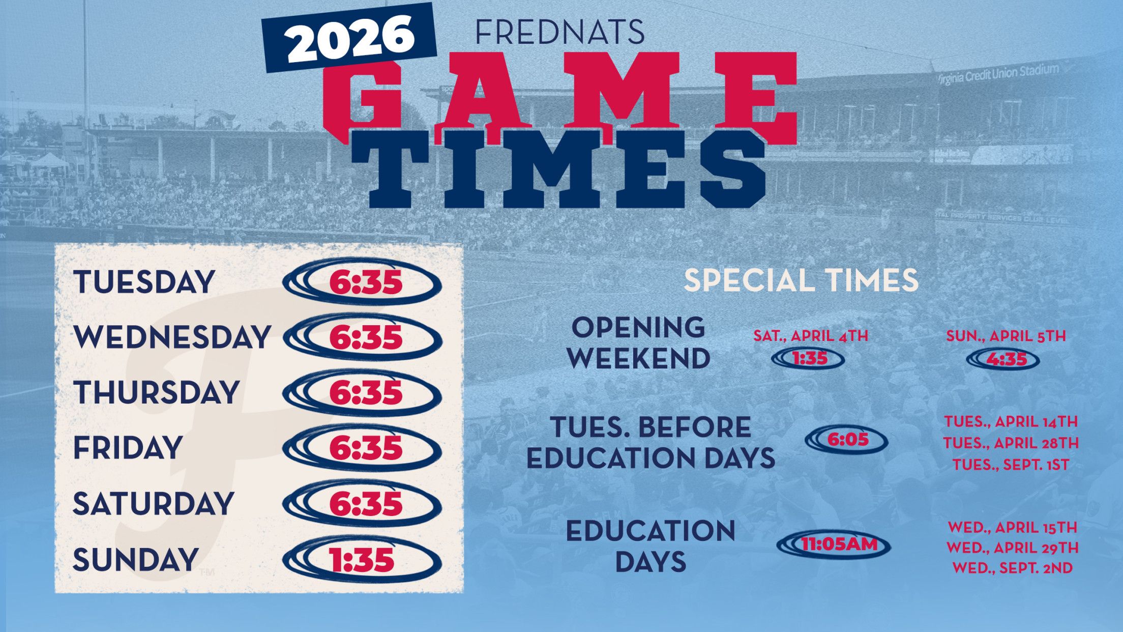 Changes from 2025 include all Tuesday-Saturday games moving to a 6:35 p.m. start, with a few exceptions for Education Days listed below. In addition, all Sunday games (other than Opening Weekend) throughout the season will start at 1:35 p.m.
