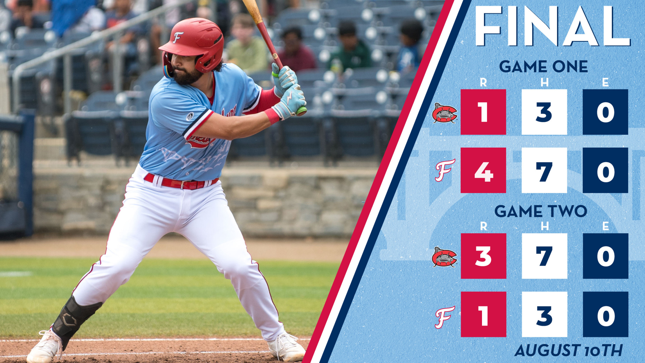 FREDERICKSBURG , VA - The Mudcats and FredNats split a twin bill, with Fredericksburg winning game one and Carolina taking game two. Fredericksburg is 26-15 (61-45) after the DH, and Carolina is 22-18 (62-42).