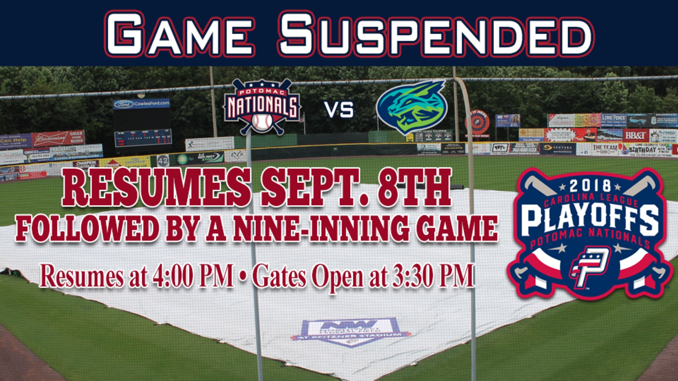 Game Three will resume at 4:00pm on Saturday, with Potomac leading 4-0 in the top of the sixth inning, with a runner on first base and one out. The teams will complete Game Three, and then play a nine-inning Game Four matchup approximately 30 minutes after the completion of the suspended game. Gates to Northwest Federal Field at Pfitzner Stadium will open at 3:30pm on Saturday.