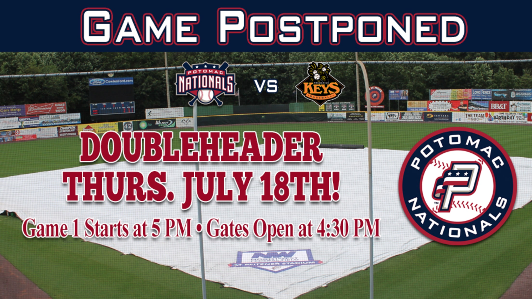 Woodbridge, VA---Wet Grounds have has postponed Wednesday night's matchup between the Potomac Nationals and the Frederick Keys at Northwest Federal Field at Pfitzner Stadium. Wednesday night's game vs. Frederick will be made up as part of a doubleheader on Thursday, July 18th at Northwest Federal Field, with first pitch of game one