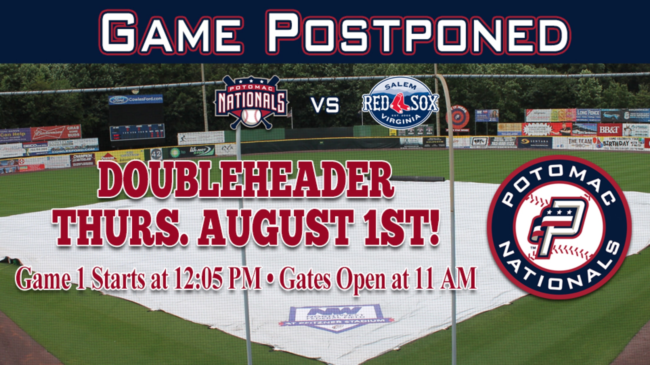 Woodbridge, VA---Constant rain has postponed Wednesday night's matchup between the Potomac Nationals and the Salem Red Sox at Northwest Federal Field at Pfitzner Stadium. Wednesday night's game vs. Salem will be made up as part of a doubleheader on Thursday, August 1st at Northwest Federal Field, with first pitch of game one