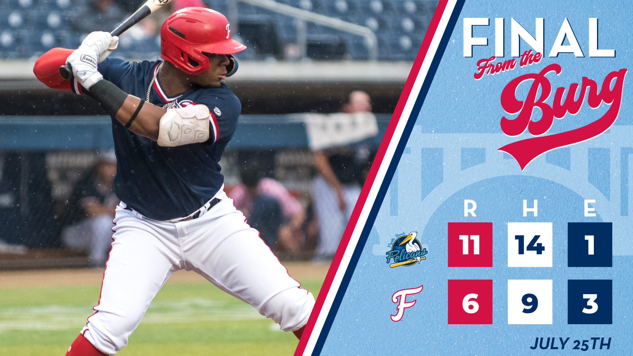 FREDERICKSBURG, VA - The Myrtle Beach Pelicans won a 11-6 slugfest in the series opener against the FredNats.