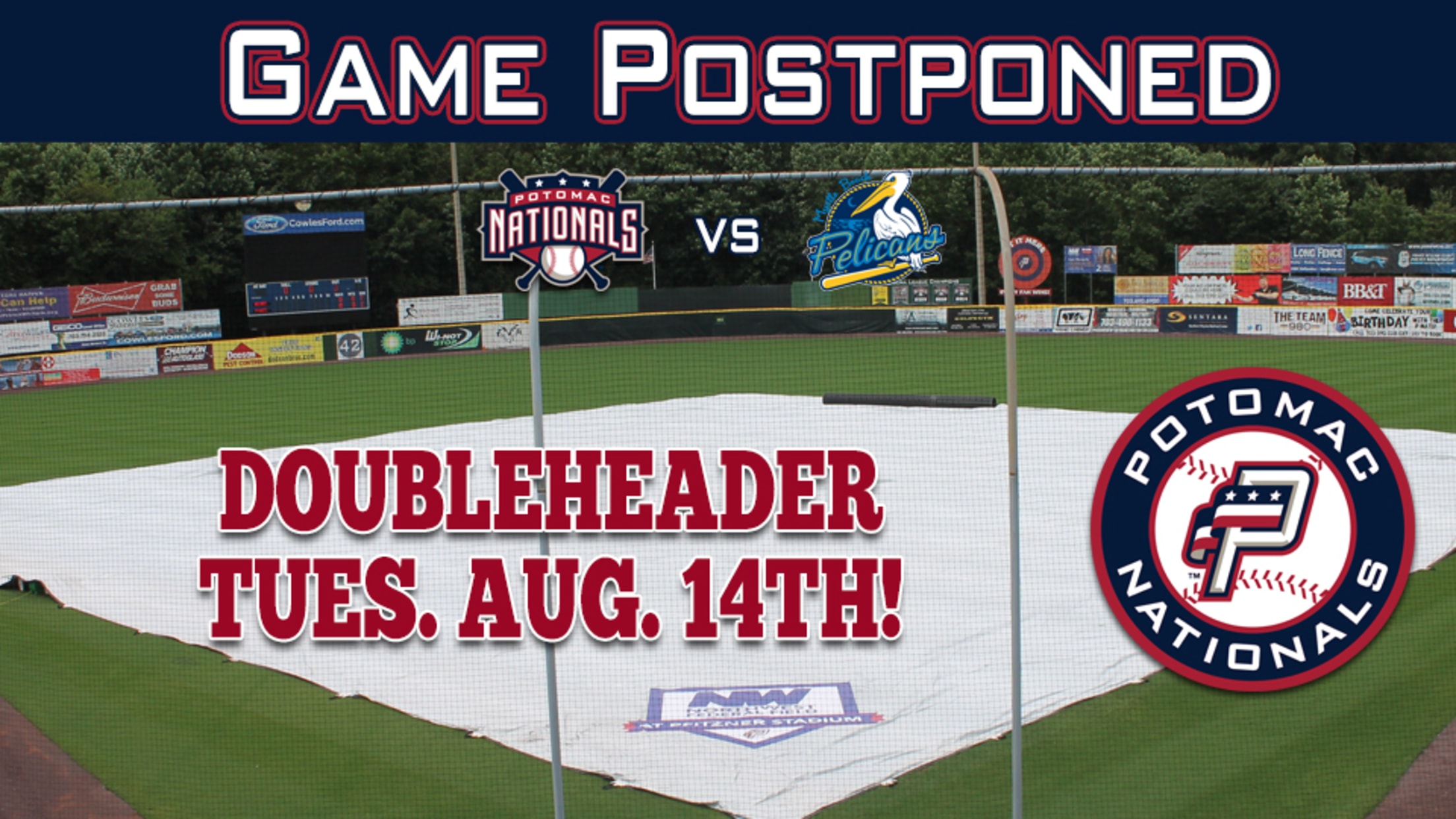 Woodbridge, VA---Wet grounds and the threat of severe thunderstorms have postponed the series opener between the Potomac Nationals (56-49, 19-19) and the Myrtle Beach Pelicans (50-60, 16-24) at Northwest Federal Field at Pfitzner Stadium. The game will be made up as part of a doubleheader at Northwest Federal Field on Tuesday, August 14th at 5:00pm.