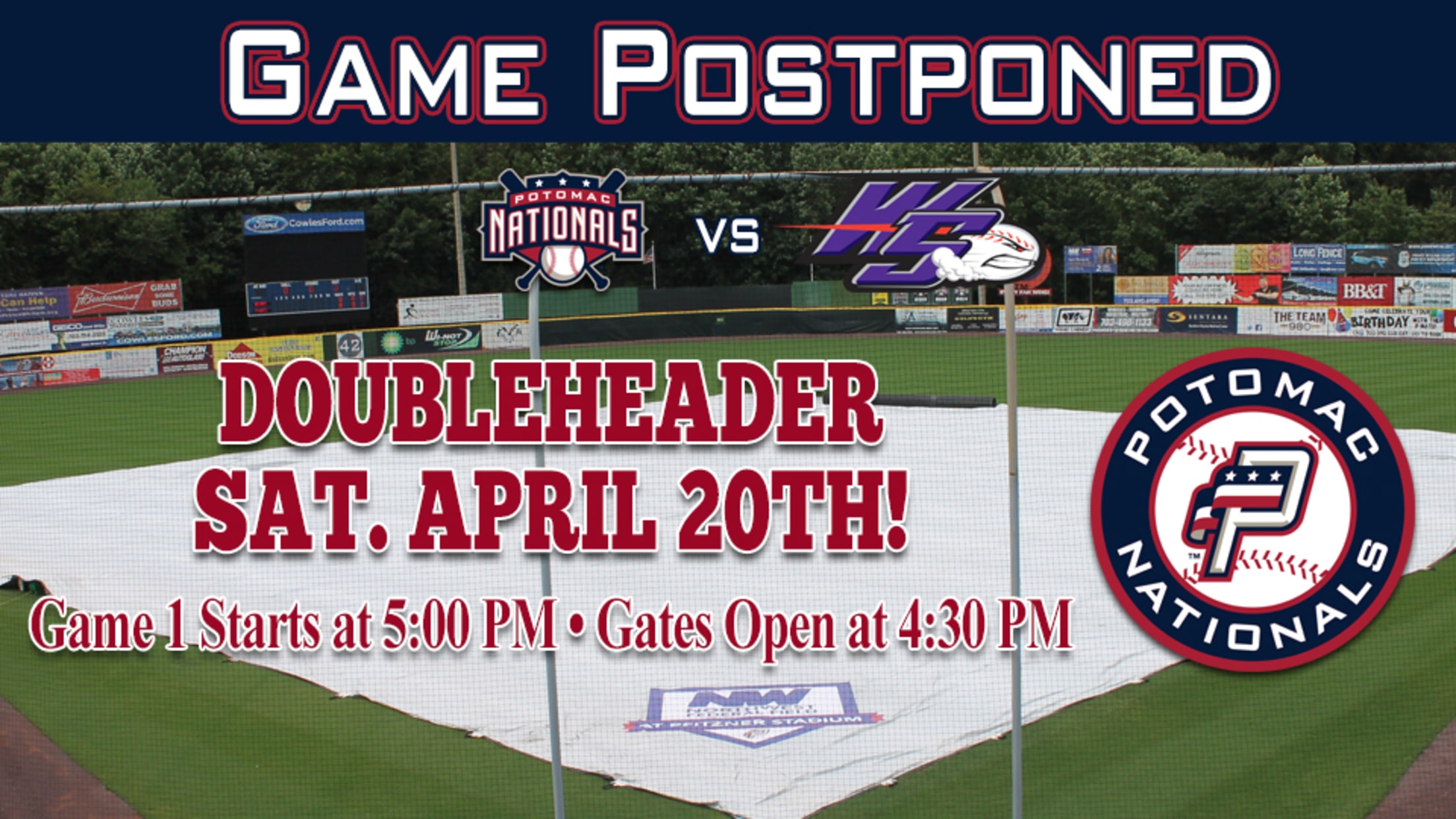 Woodbridge, VA---Constant rain at Northwest Federal Field at Pfitzner Stadium has postponed the Friday night matchup between the Potomac Nationals (6-9) and Winston-Salem Dash (7-8). Friday night's game vs. the Dash will be made up as part of a doubleheader on Saturday, April 20th at Northwest Federal Field, with first pitch of